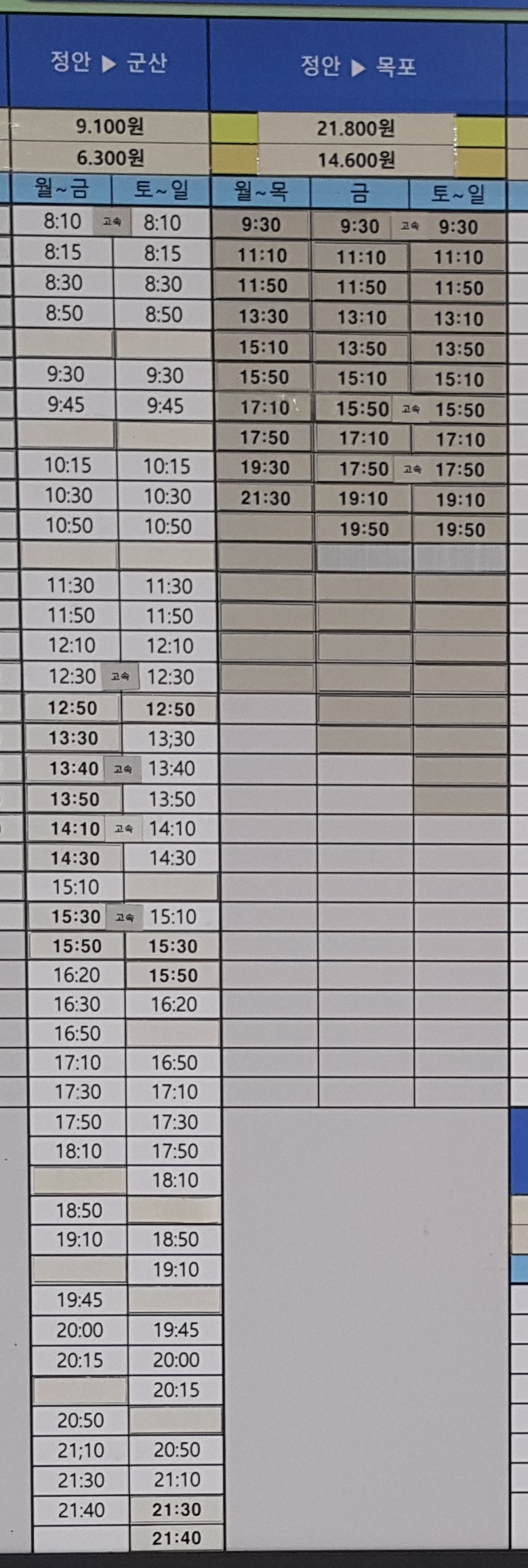 정안 출발 영산표(나주), 완도, 담양, 보성(벌교) 방면.