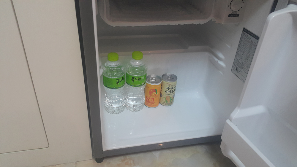 냉장고에는 생수 2병과 캔 2개가 들어있다.