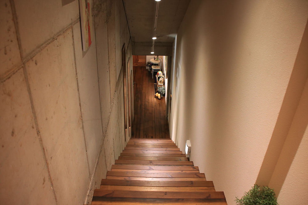 현관으로 들어오면 1층이며 지하로 내려가는 계단과 2층으로 올라가는 계단이 실내에 마련되어 있습니다.
