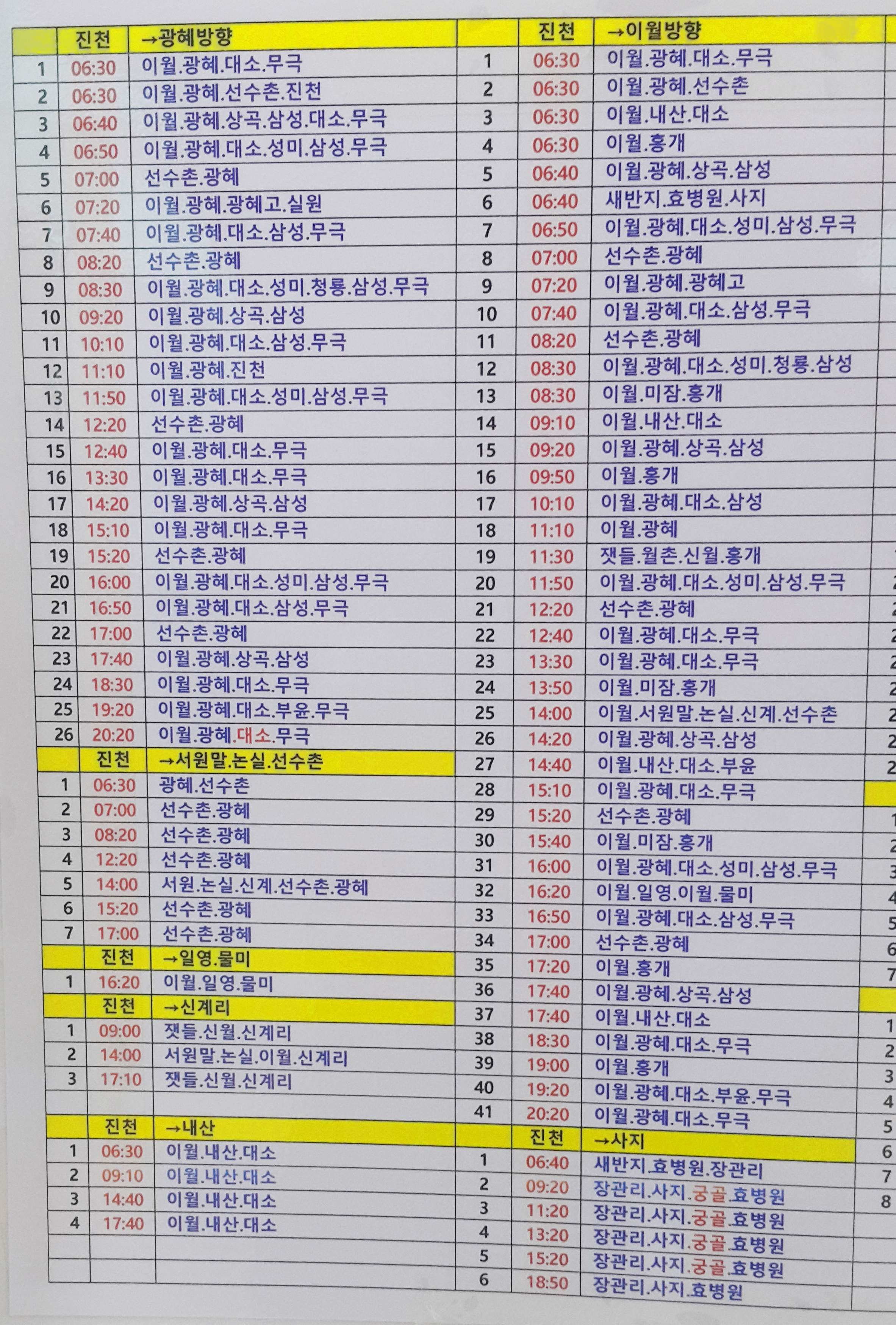 진천 출발 광혜, 서원말, 논실, 선수촌, 일영, 물미, 신계리, 내산, 이월, 사지 방향.