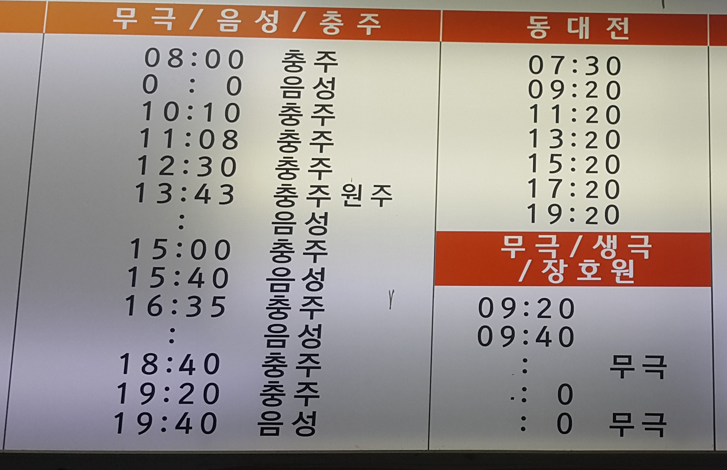 진천시외버스터미널 출발 무극, 음성, 충주, 동대전, 생극, 장호원 방면.