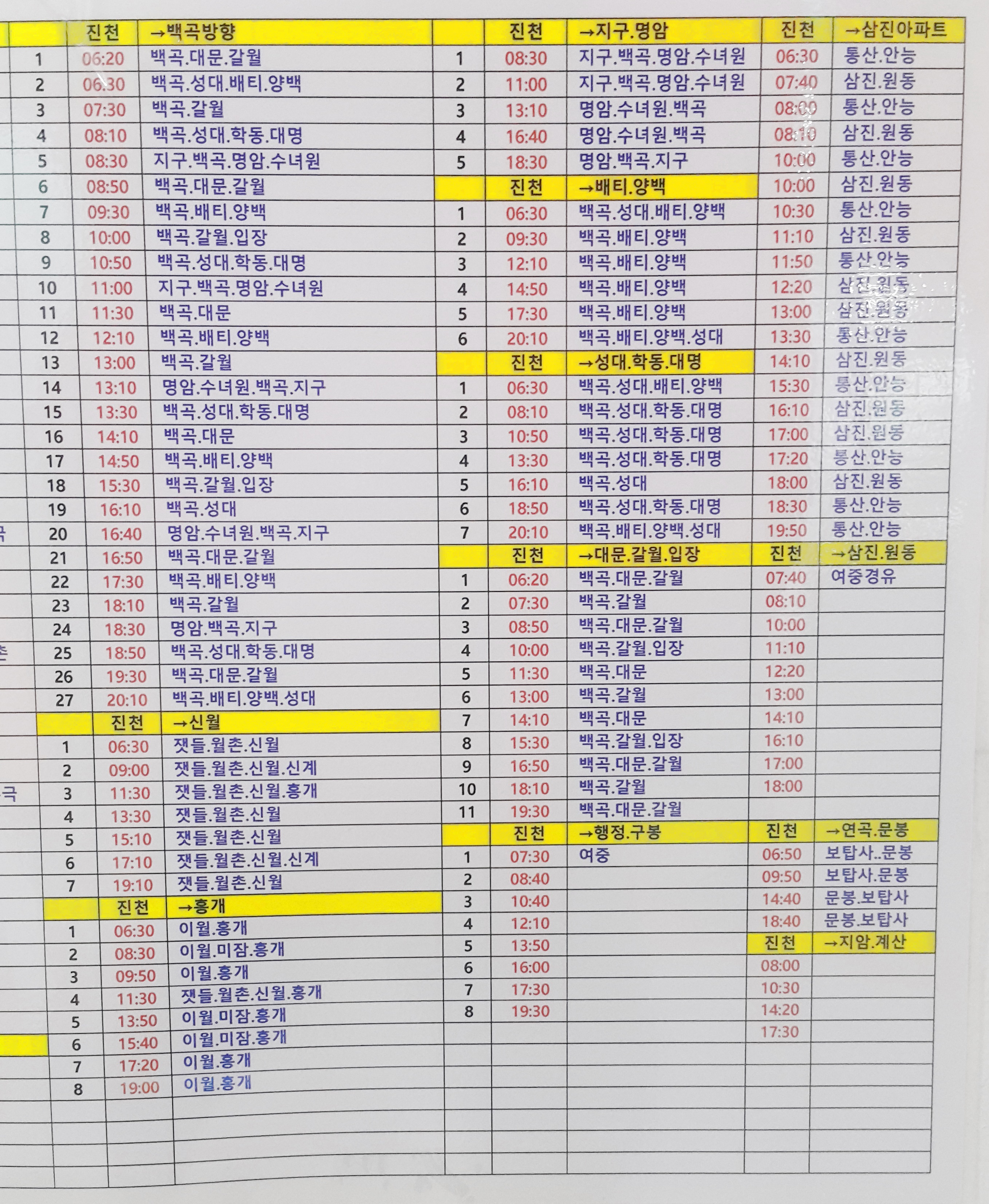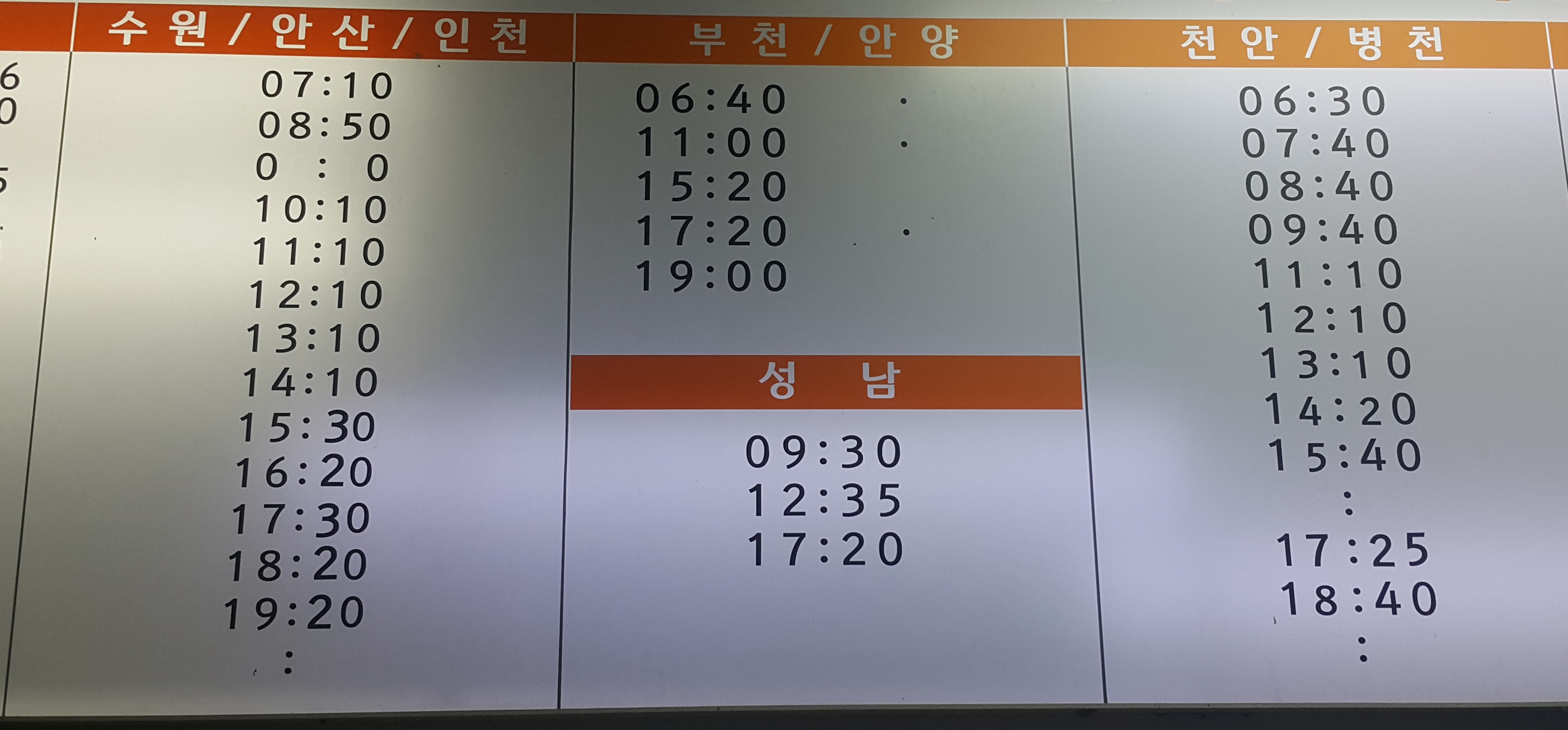 진천시외버스터미널 출발 수원, 안산, 인천, 부천, 안양, 성남, 천안, 병천 방면.