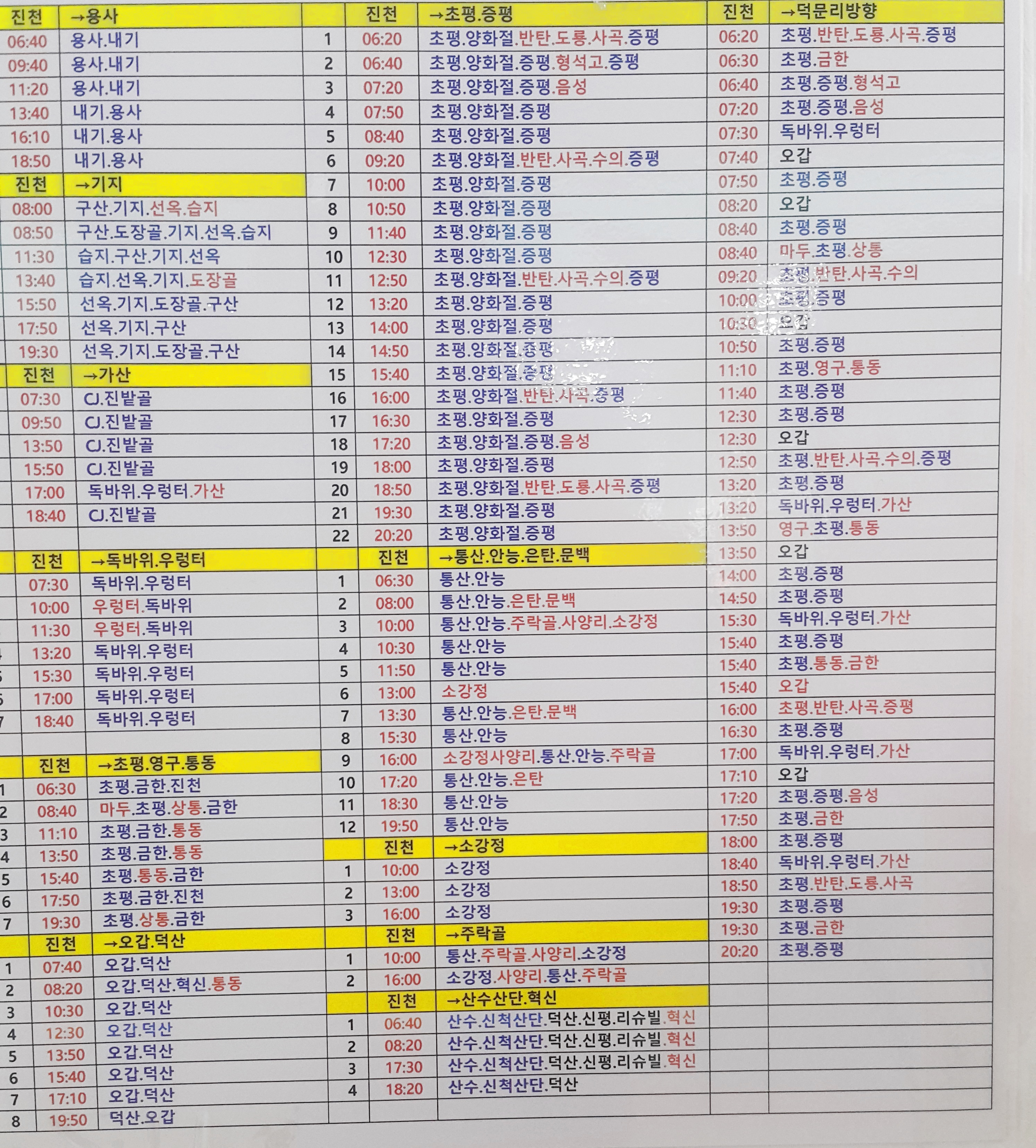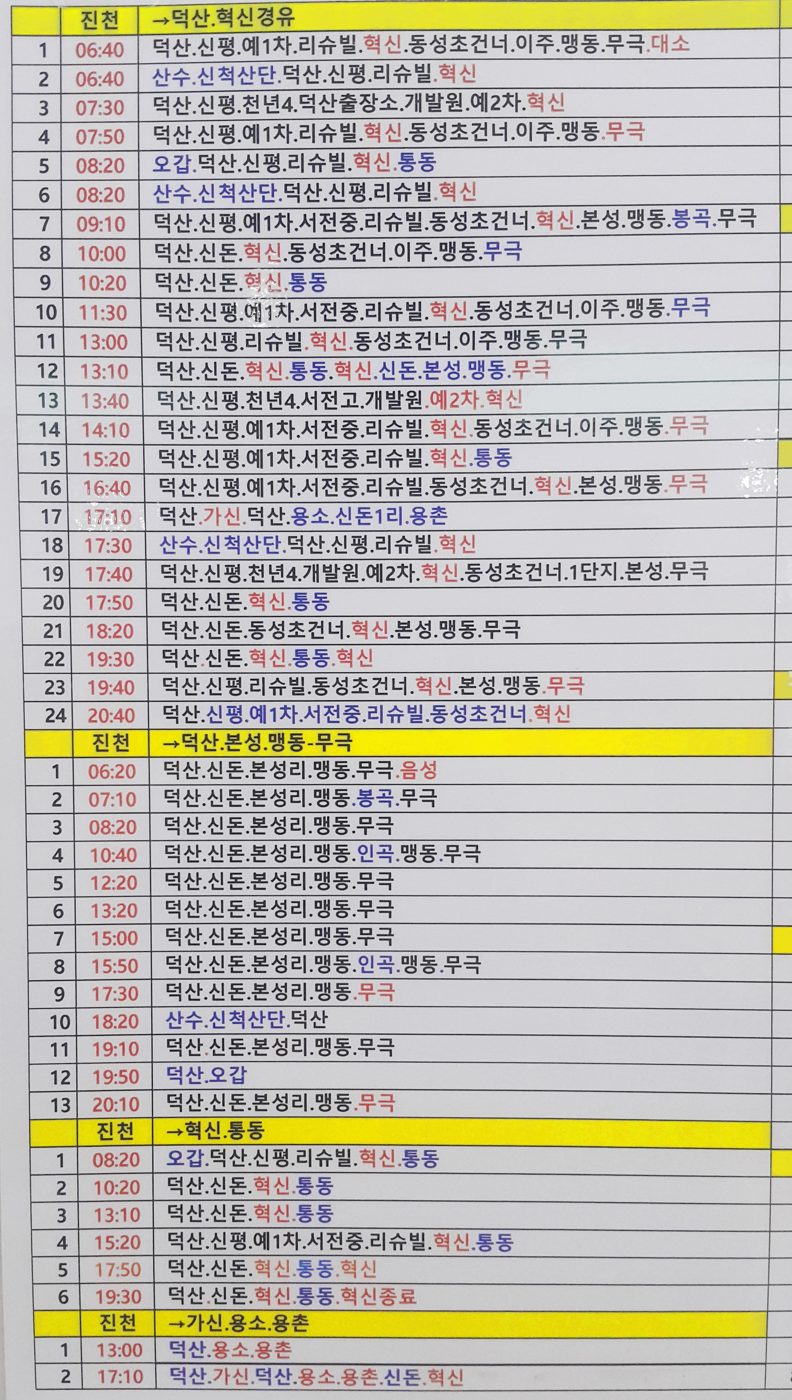 진천 출발 덕산, 본성, 맹동, 무극 방면.