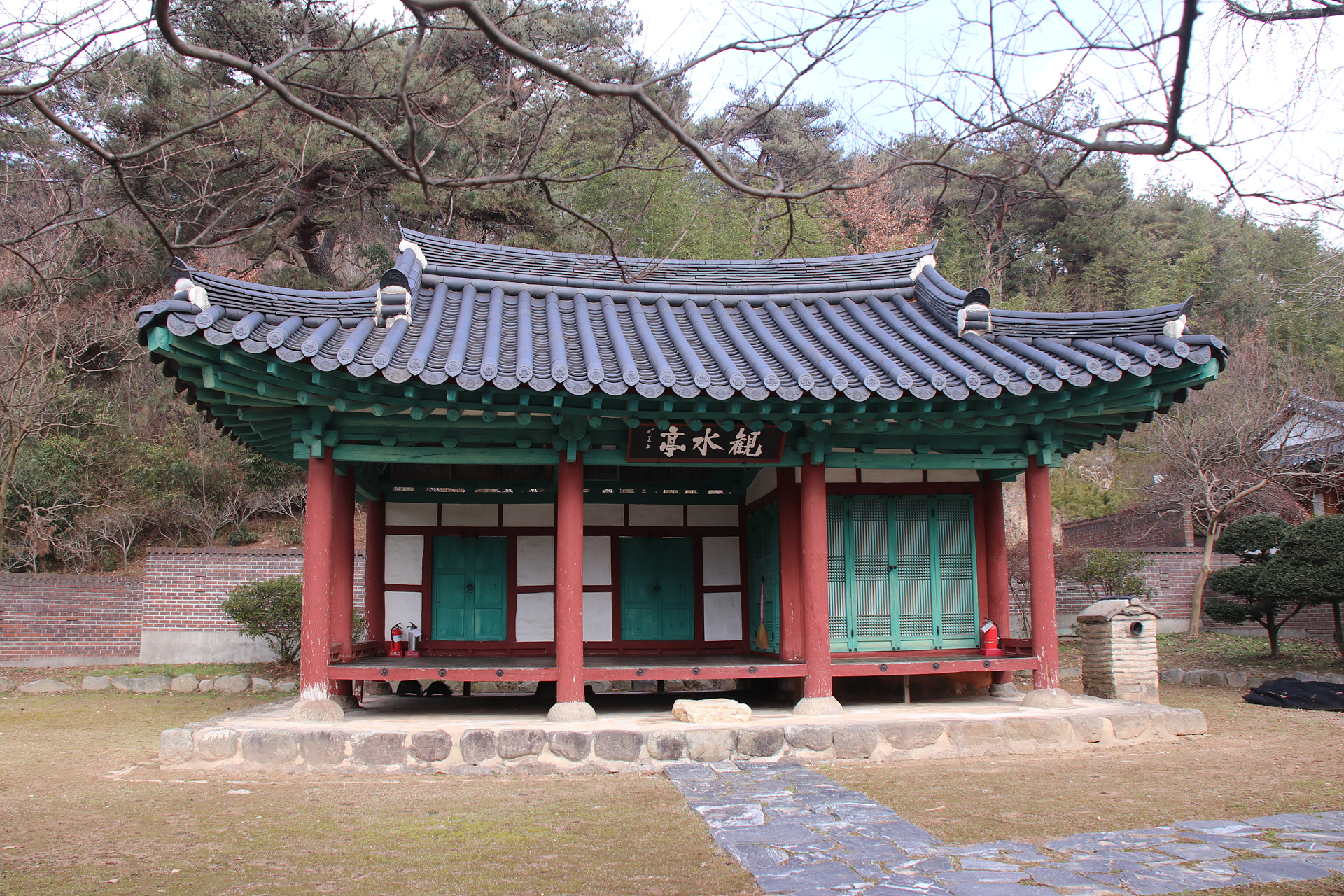 현판과 벽면에 관수정이라는 글이 있는데 벽이 빨간 벽돌로 올려져 있어