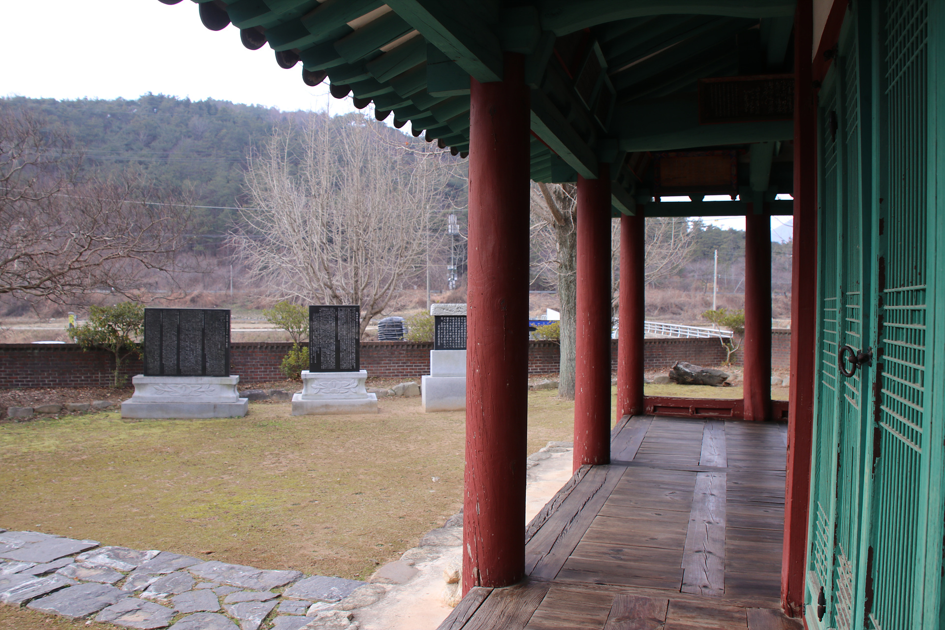 마당에는 세 개의 비석이 놓여 있습니다.