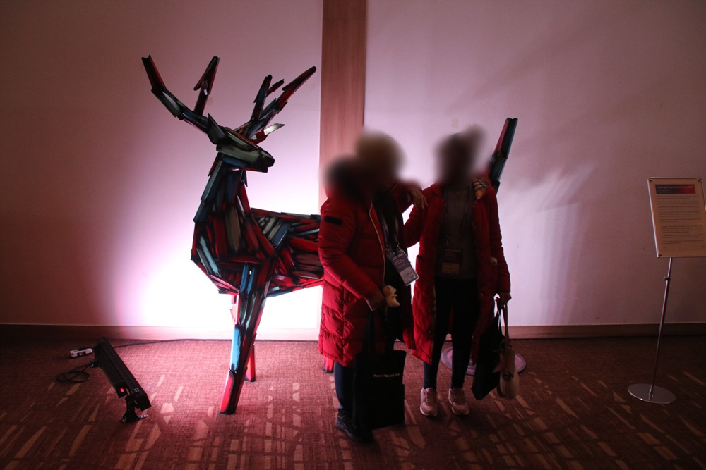 사슴 조형물 앞에서 기념 촬영하는 사람들의 모습