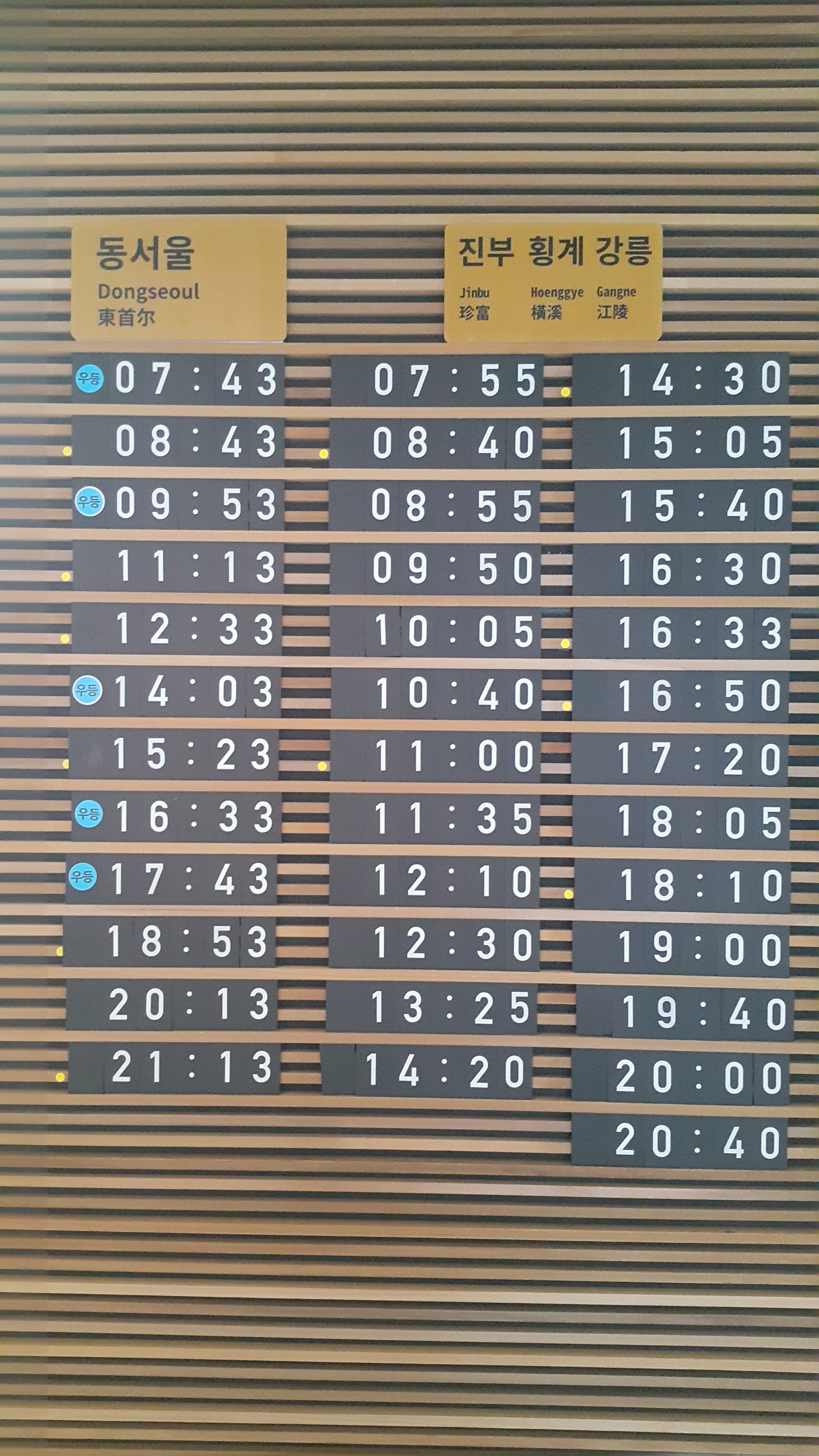 장평 출발 동서울, 진부, 횡계, 강릉.