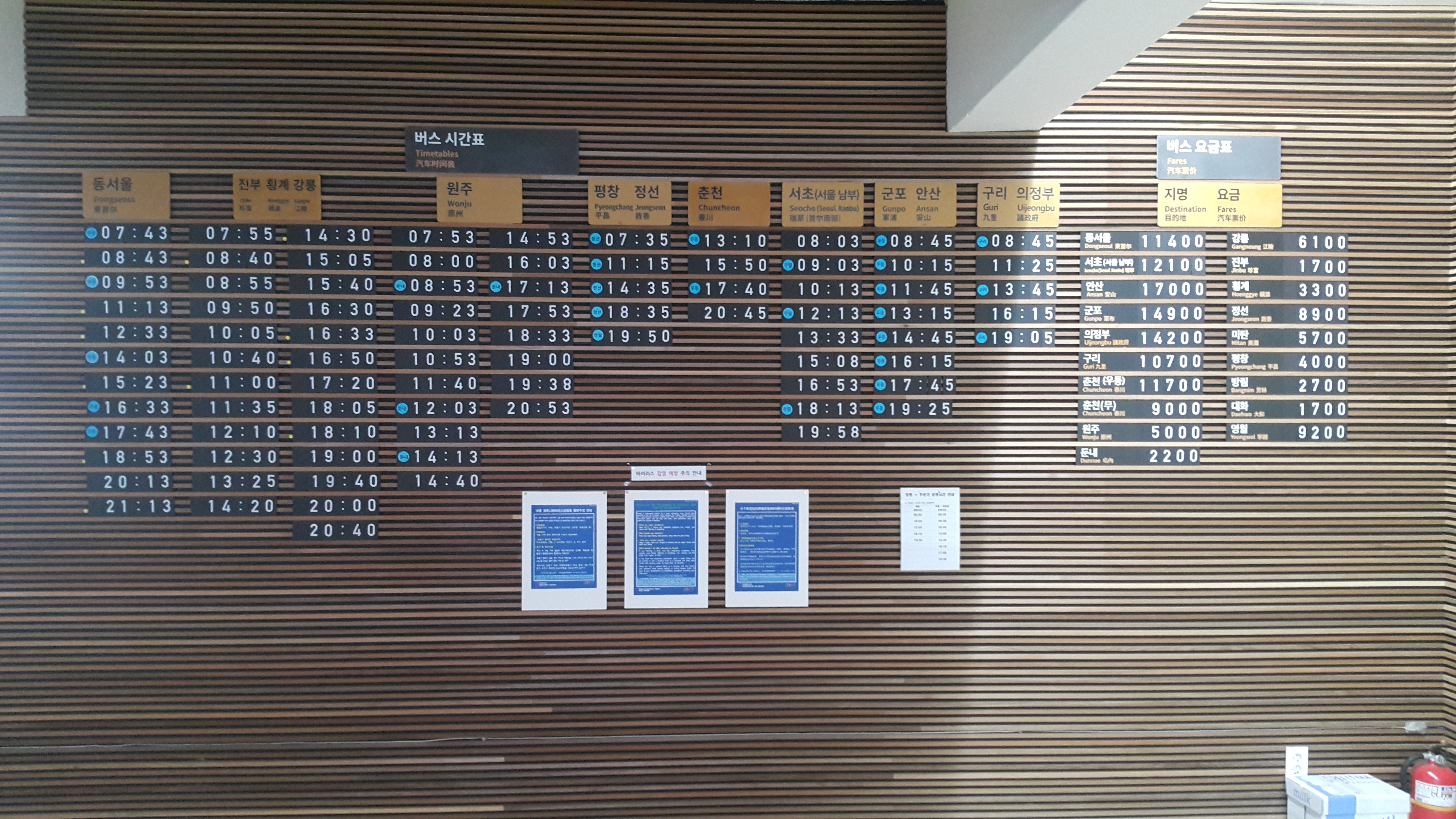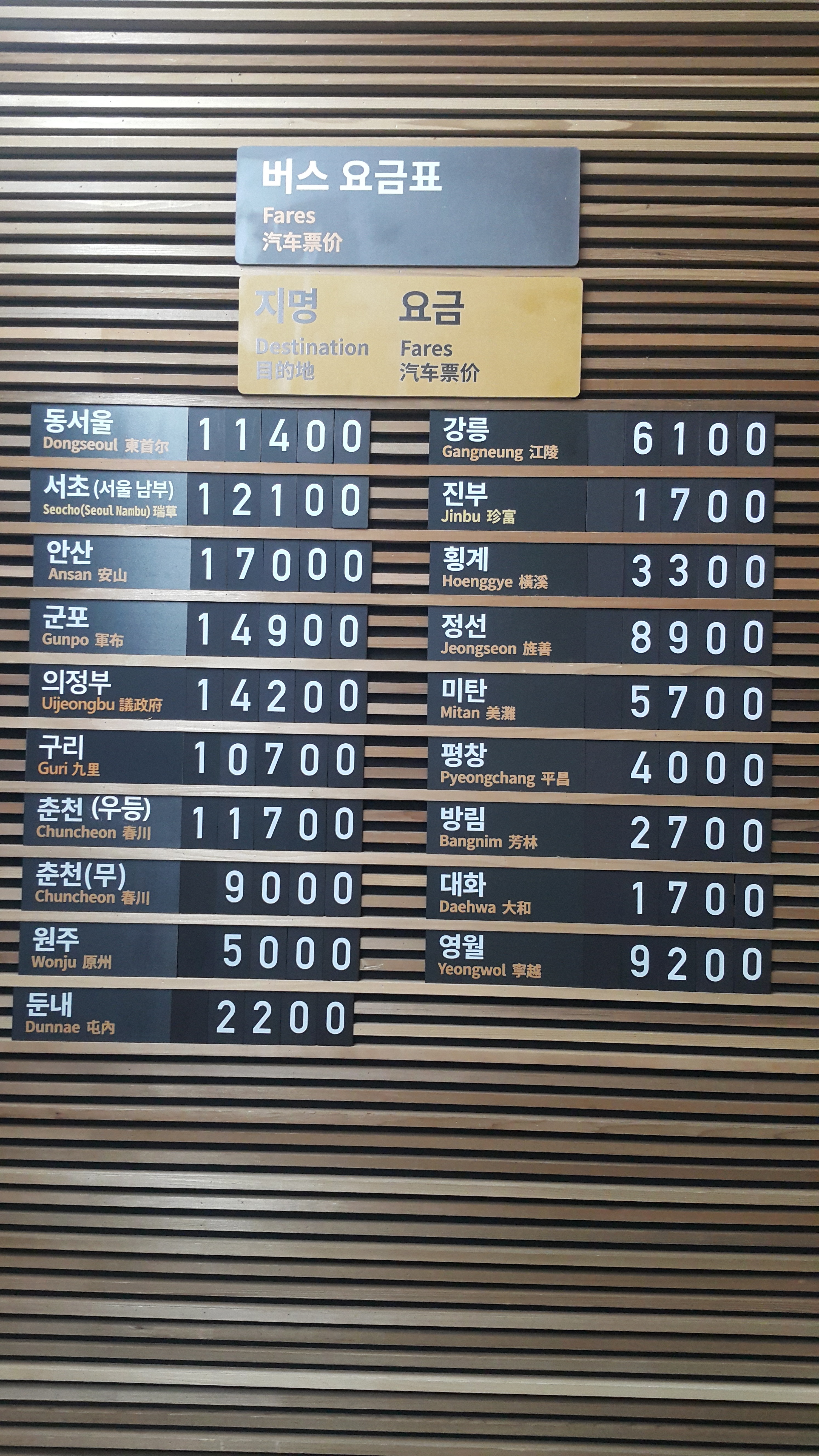 장평시외버스터미널 버스 요금표