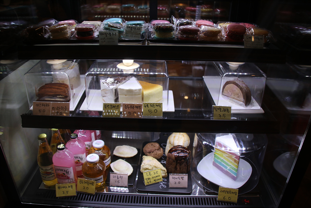 디저트 종류로 수제둥카롱, 블랙 포레스트, 순수우유케잌, 뉴욕치즈케잌, 밀키롤, 초코롤, 마들렌, 스로25, 미니식빵, 레인보우 케잌 등이 선택을 기다리고 있습니다.