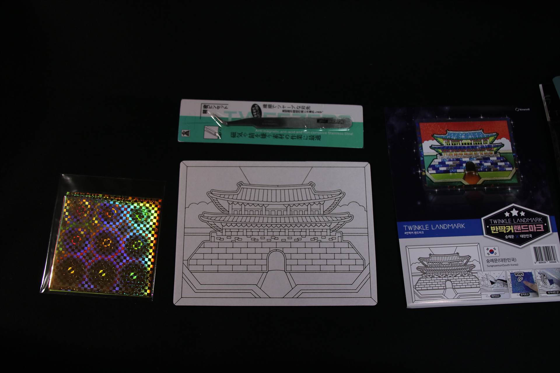 내용물을 개봉하니 고품질의 핀셋과 숭례문 도안지 그리고 은박지가 가득 들어있습니다.