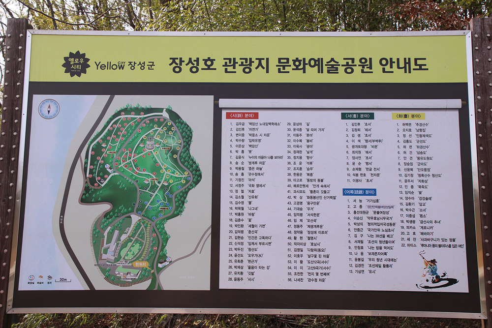 장성호 문화예술공원에서는 산책하기도 좋고 여러가지 시와 예술작품을 관람할 수 있으니