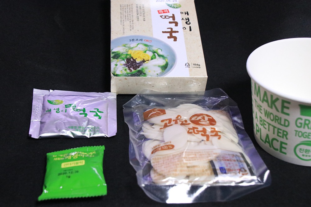 그릇에 내용물을 넣고 뜨거운 물을 붓고 2분만 기다리면 맛있는 즉석 매생이떡국이 완성됩니다.