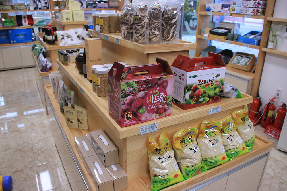 내부에는 강진의 농어업인들이 정성 들여 생산한 제품군이 선물용으로도 적합하게 고급 포장으로 마감되어 손님을 기다리고 있습니다.