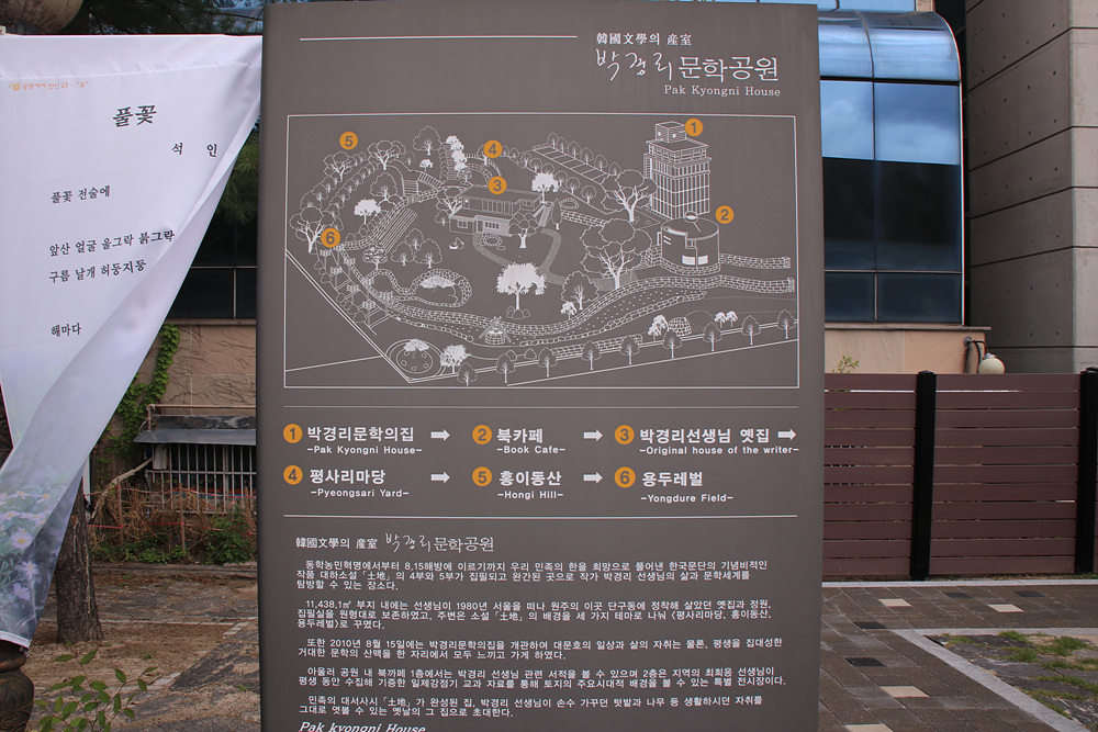 이곳은 한국 문단의 기념비적인 작품인 대하소설 《토지》를 주제로 꾸민 공원인데요,