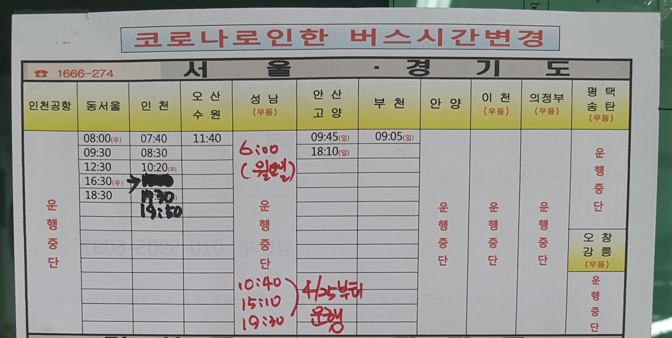 군산고속버스터미널 출발 서울, 용인 방면 시간표