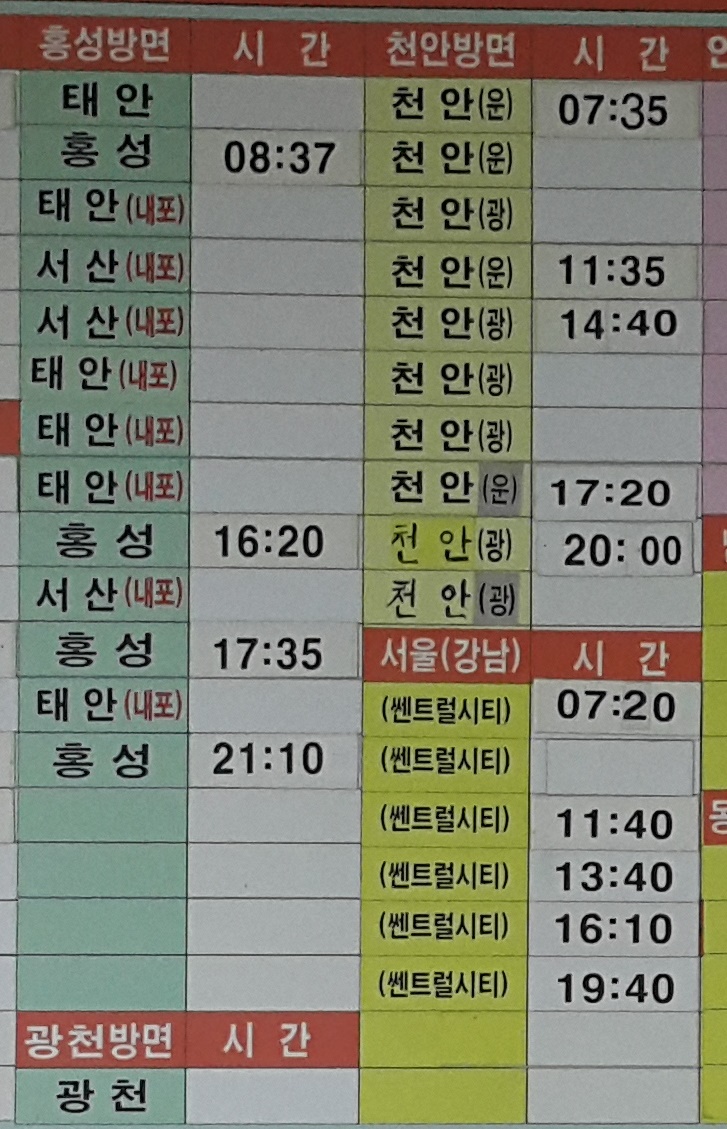 청양시외버스터미널 출발 홍성, 태안, 서산, 홍성, 광천, 천안, 서울 강남방면.