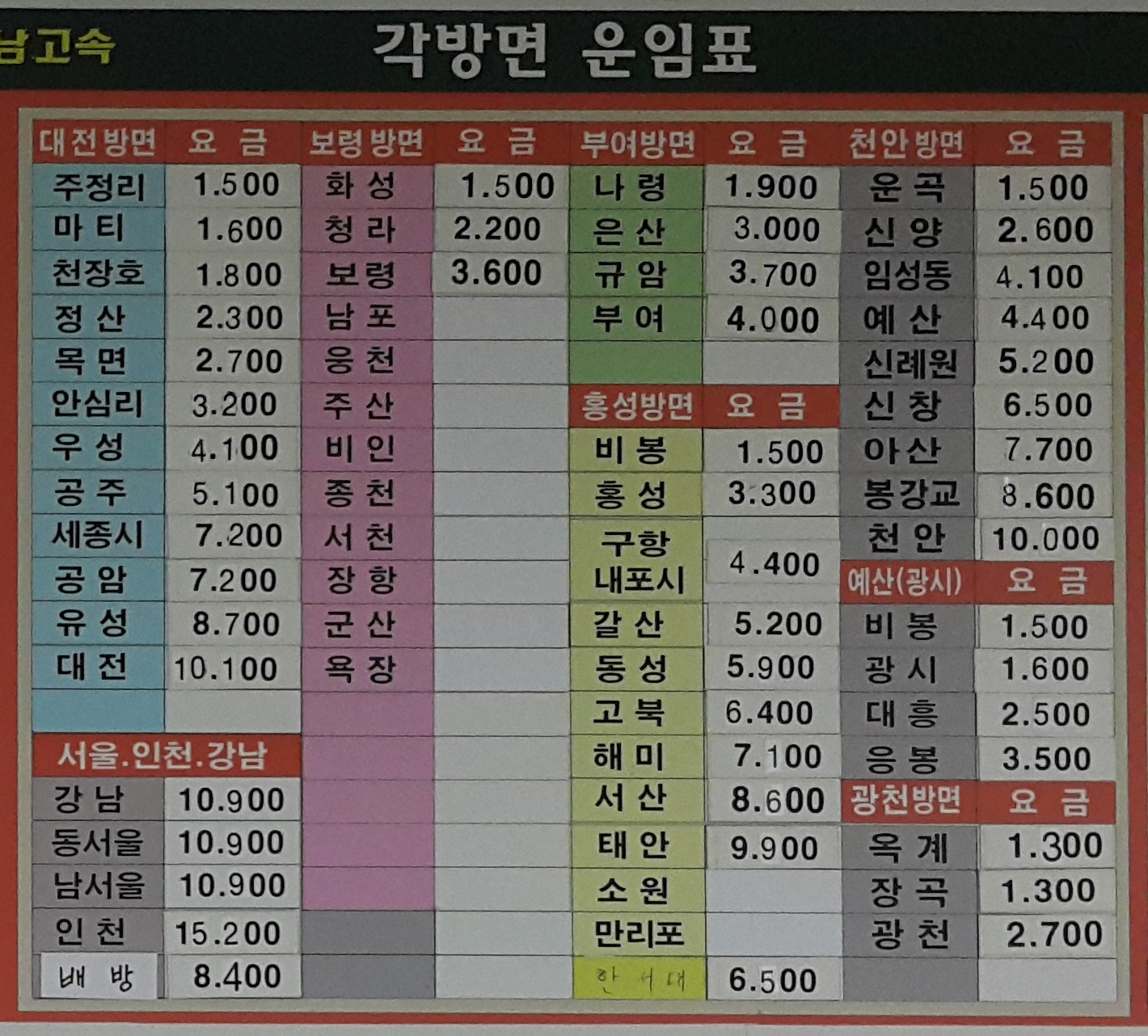청양시외버스터미널 출발 인천, 남서울, 동서울, 예산 방면.