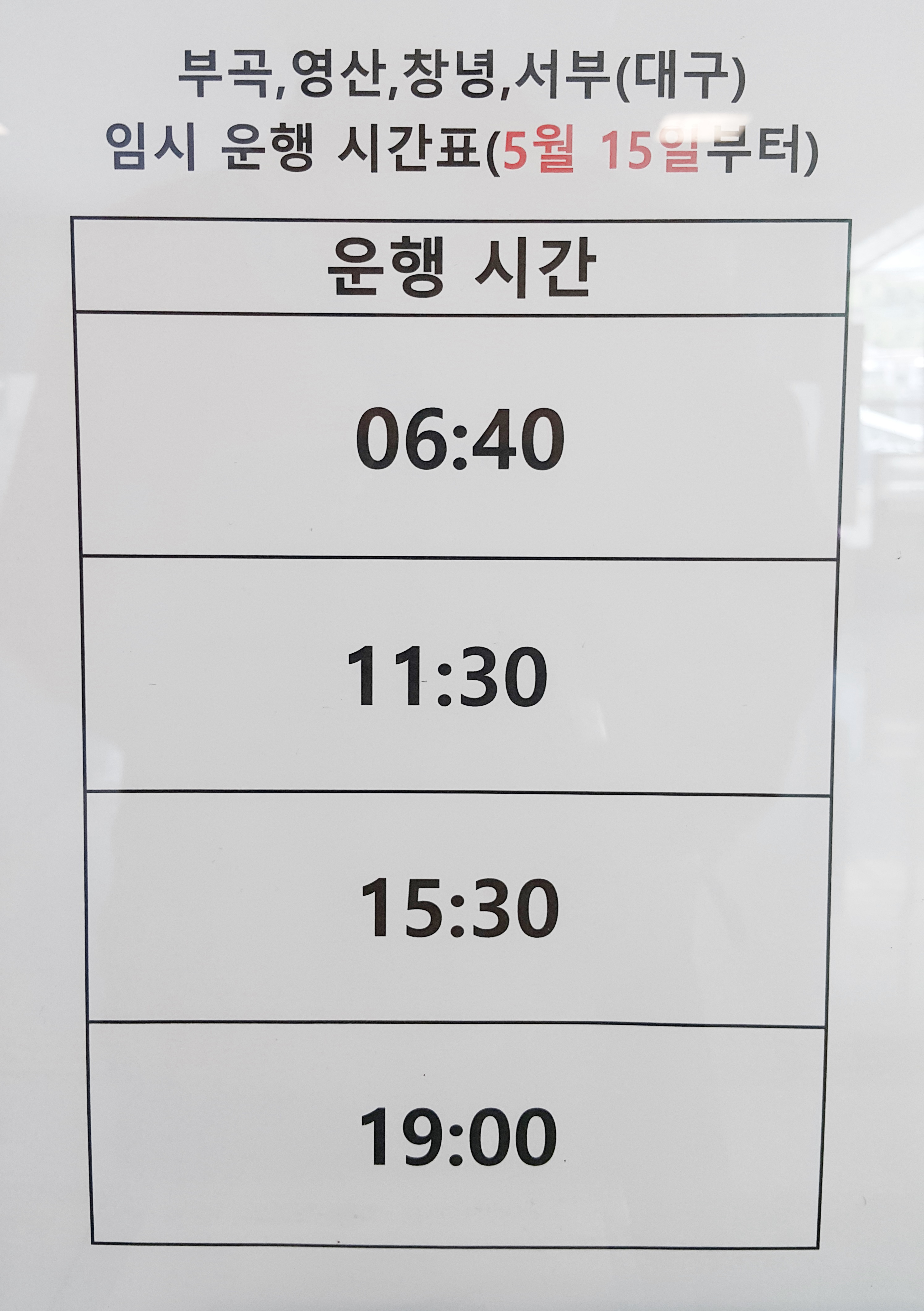 김해 발 부곡, 영산, 창녕, 대구 서부 임시 운행 시간표 5월 15일부터.