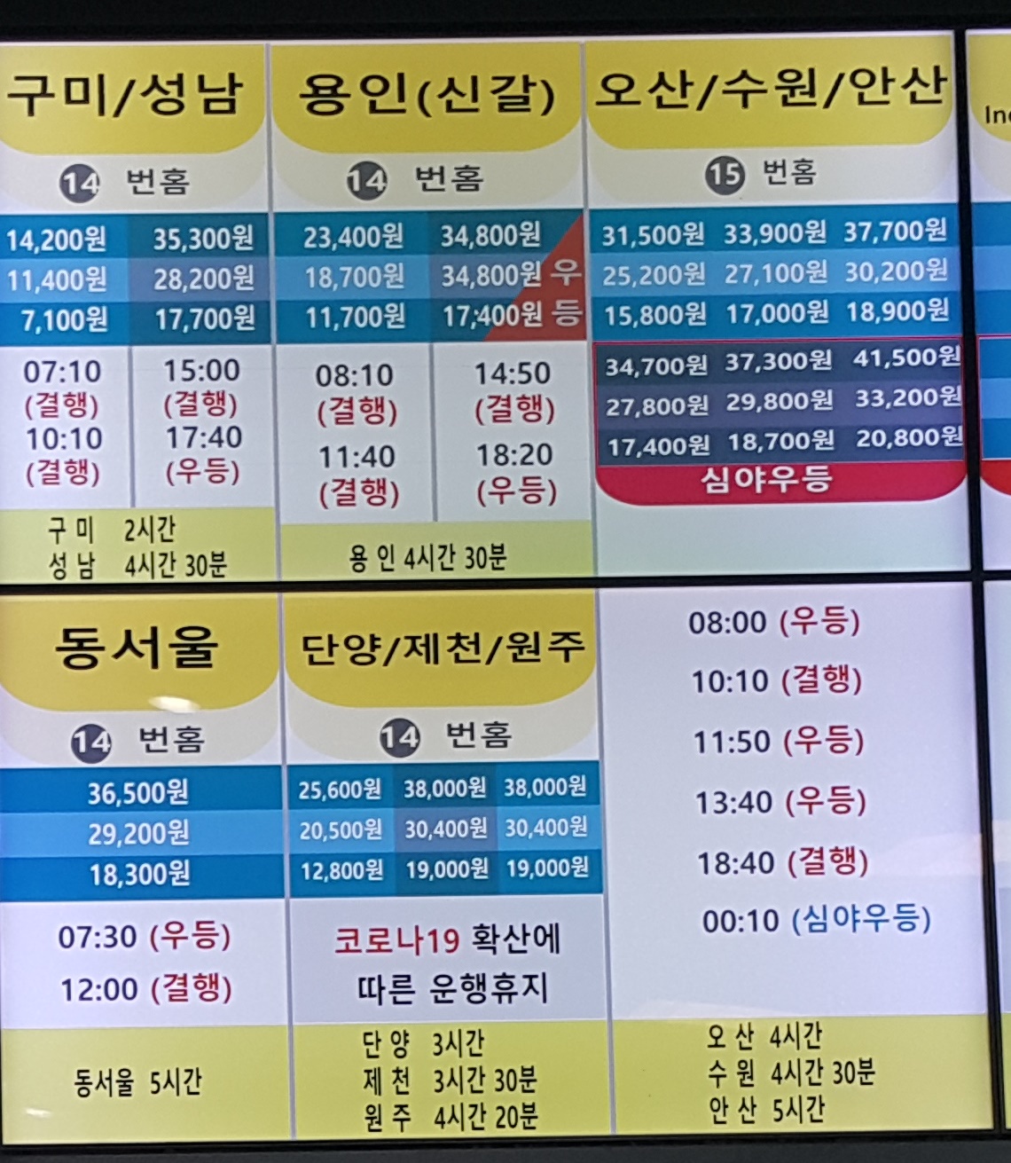 김해 출발 구미, 성남, 용인, 신갈, 동서울, 단양, 제천, 원주, 오산, 수원, 안산 방면.
