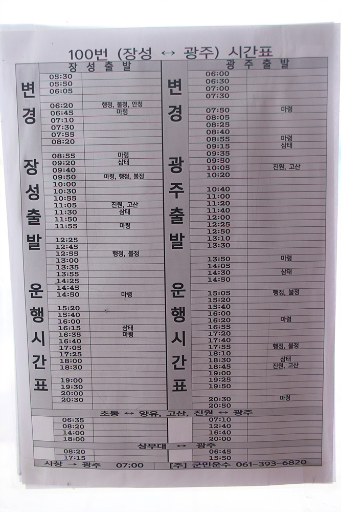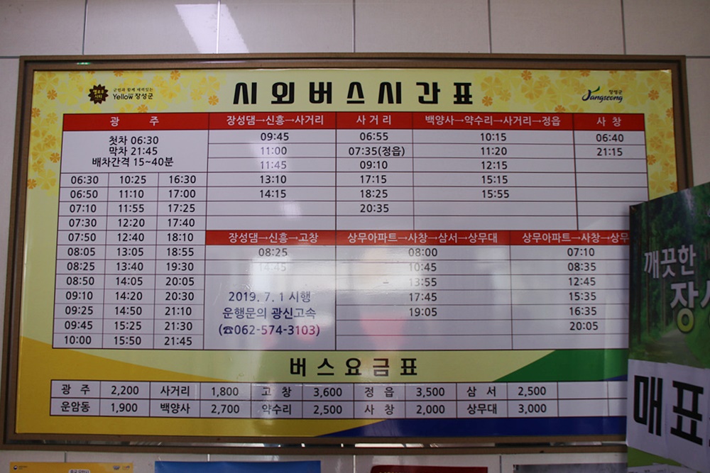 왼쪽은 장성시외버스터미널 출발 광주 터미널로 가는 시간표입니다.