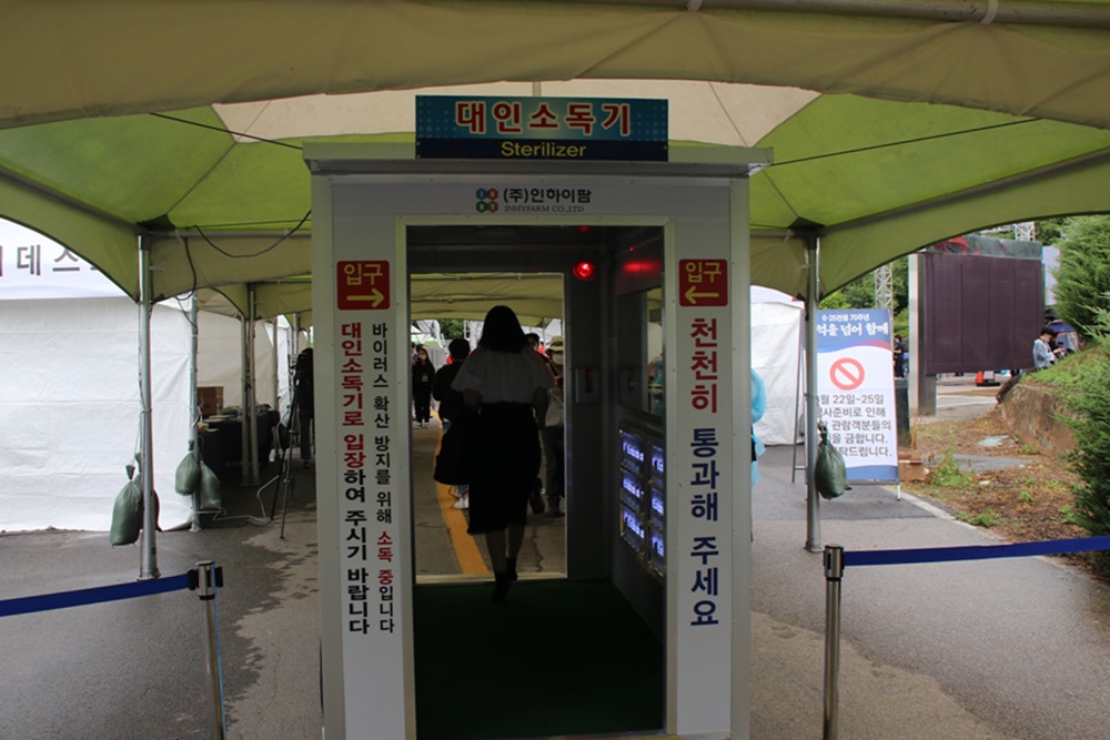 행사장 입구에는 코로나 19를 예방하기 위하여 소독터널과 손소독제를 준비하였으며