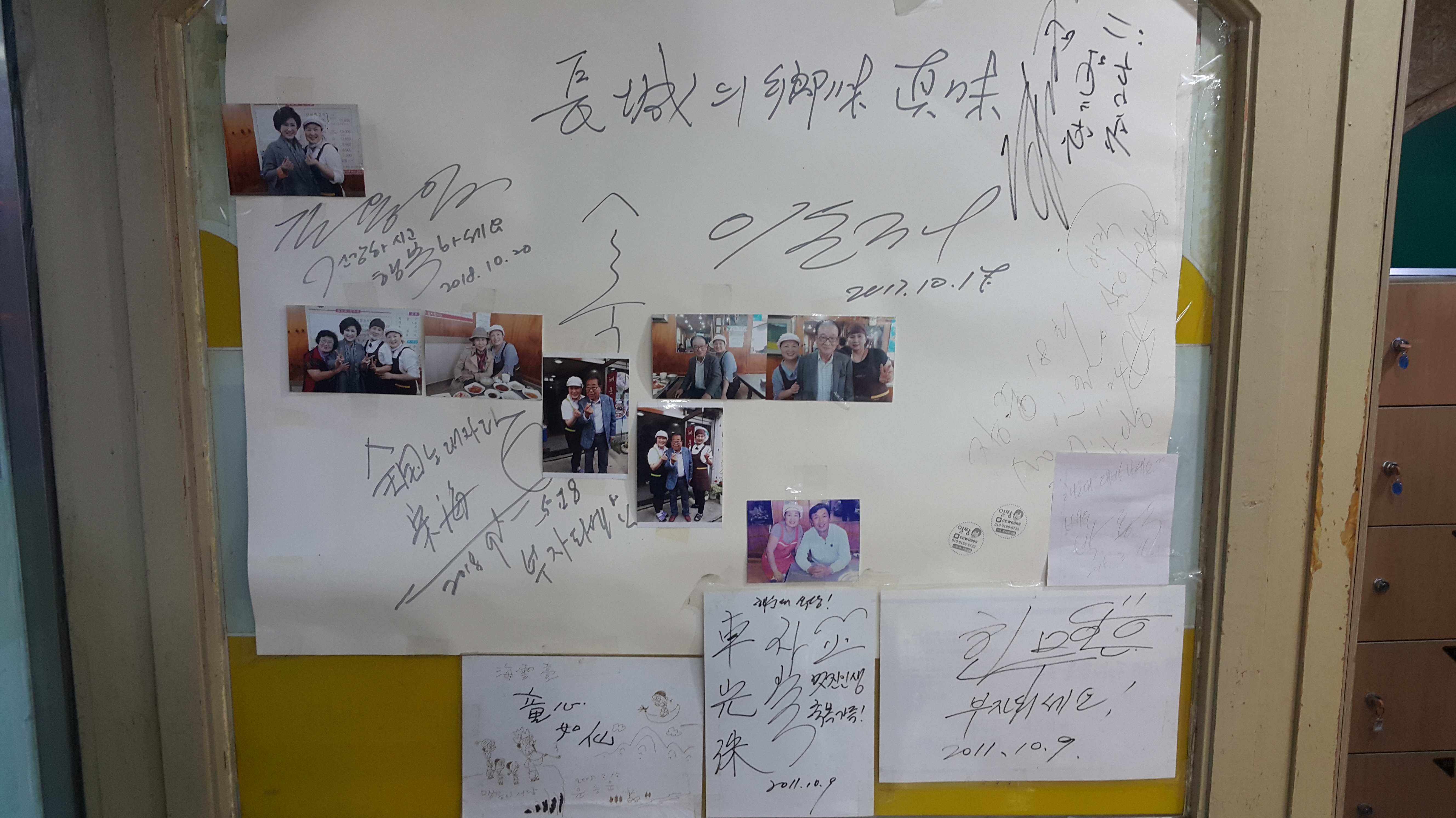 전국노래자랑 송해선생님부터 여러 연예인들이 왔다간 기록사진이 벽에 붙어 있습니다.