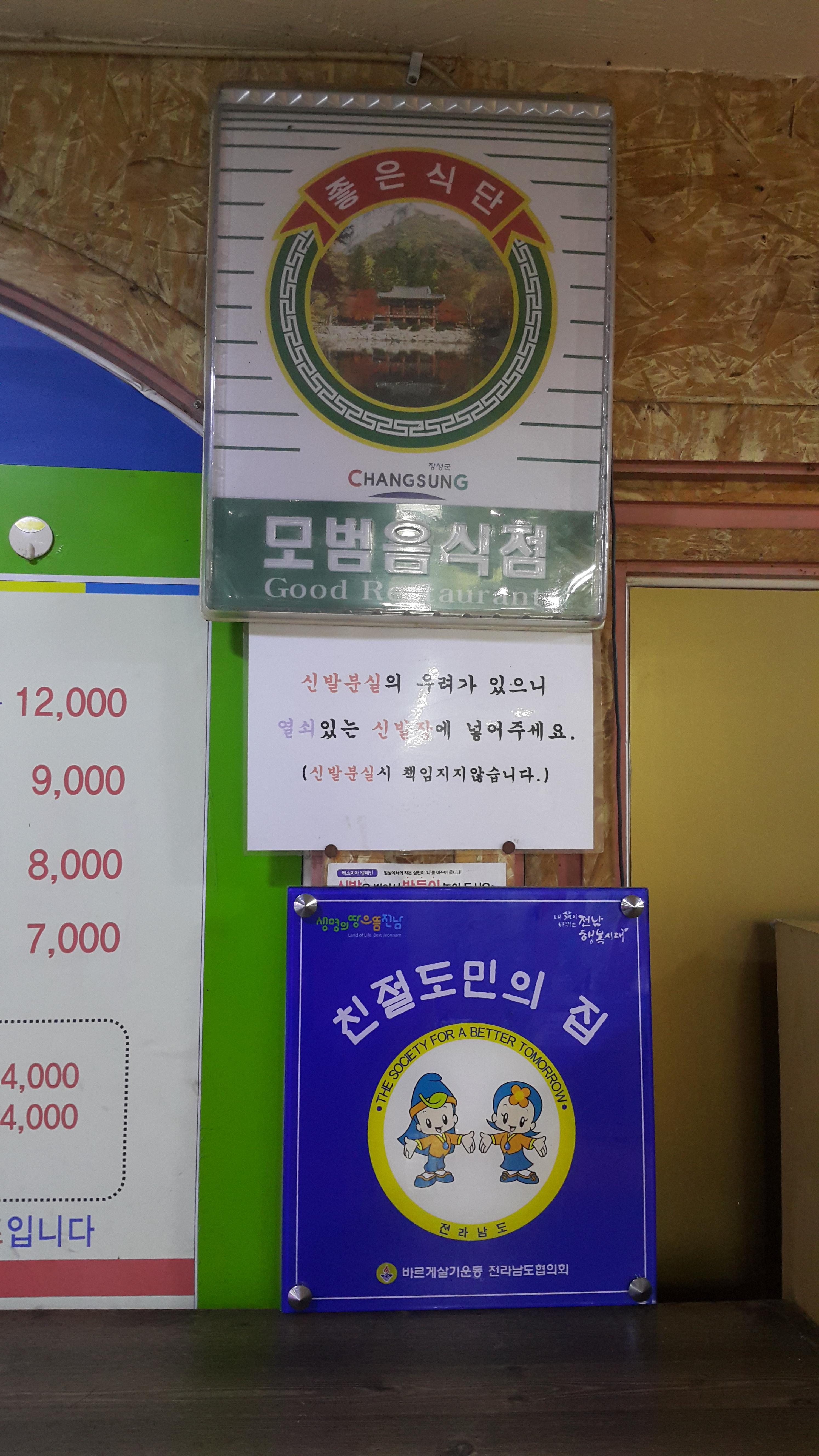 이곳 장성맛집 해운대식당은 친절도민의집이기도 하며 모범음식점이랍니다.