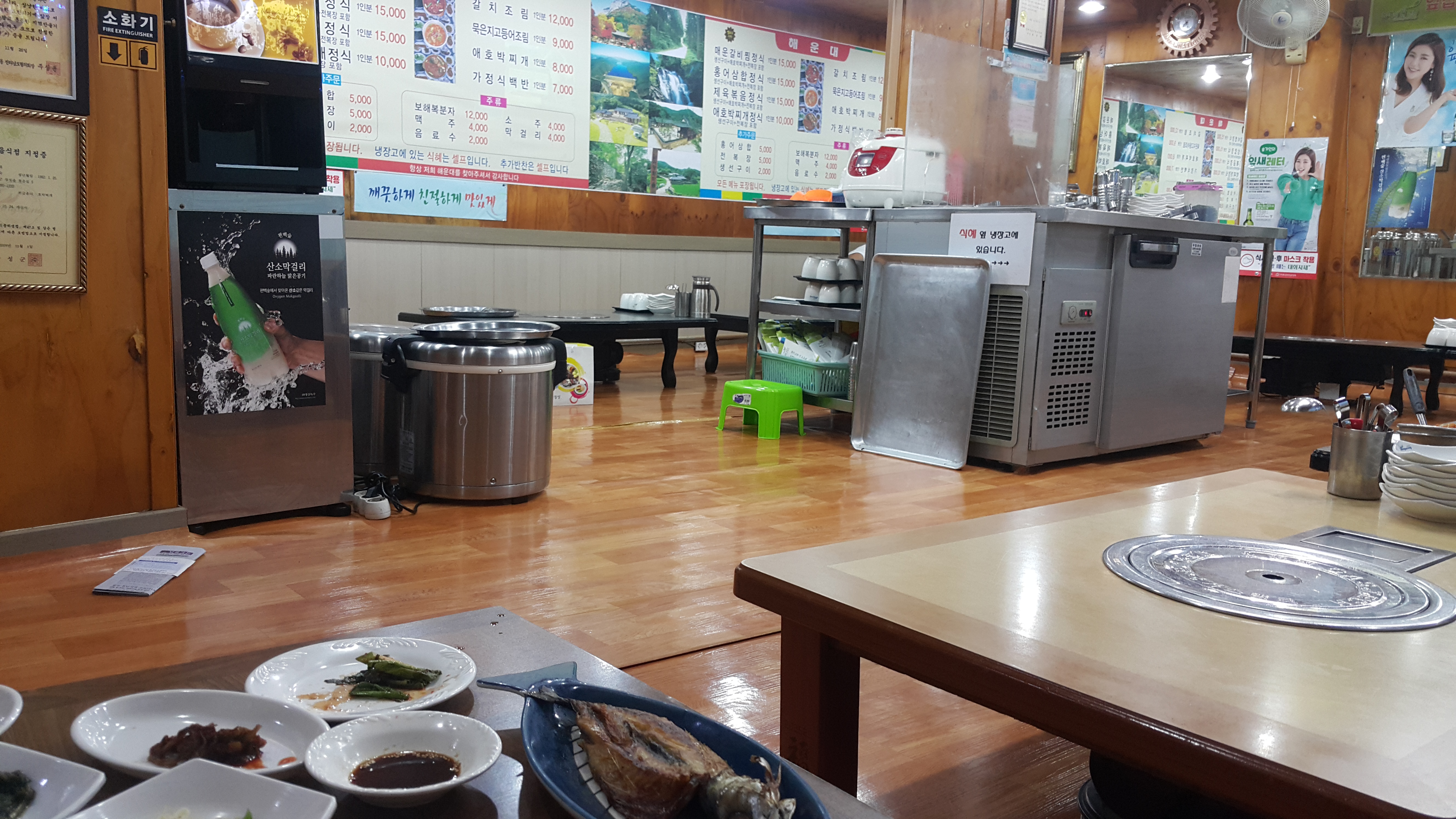 테이블에 나온 반찬이 부족하면 식당 중앙에 있는 반찬냉장고에서 추가로 가져갈 수도 있습니다.