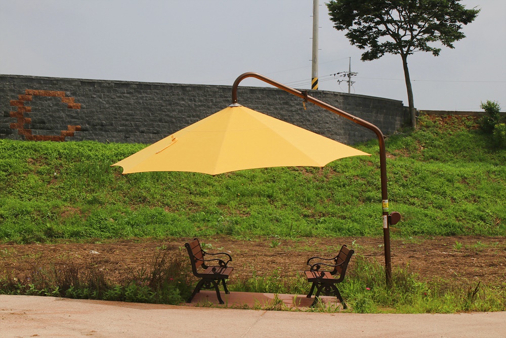 황룡강 생태공원 황미르랜드에는 뜨거운 햇빛을 차단하는 차단막이 모두 노란 우산으로 되어 있습니다.