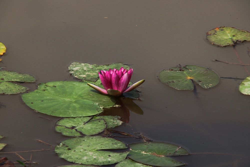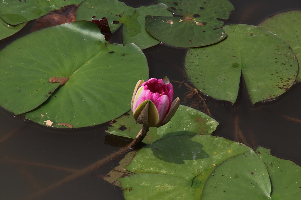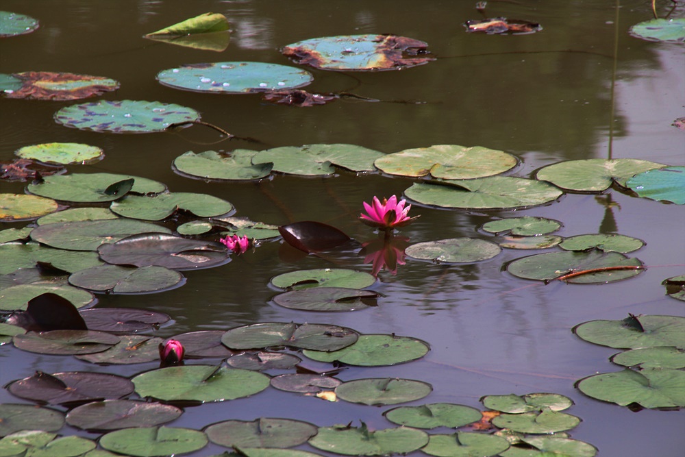 연꽃단지에는 붉은색을 띤 연꽃이 수줍게 얼굴을 내밀고 있습니다.