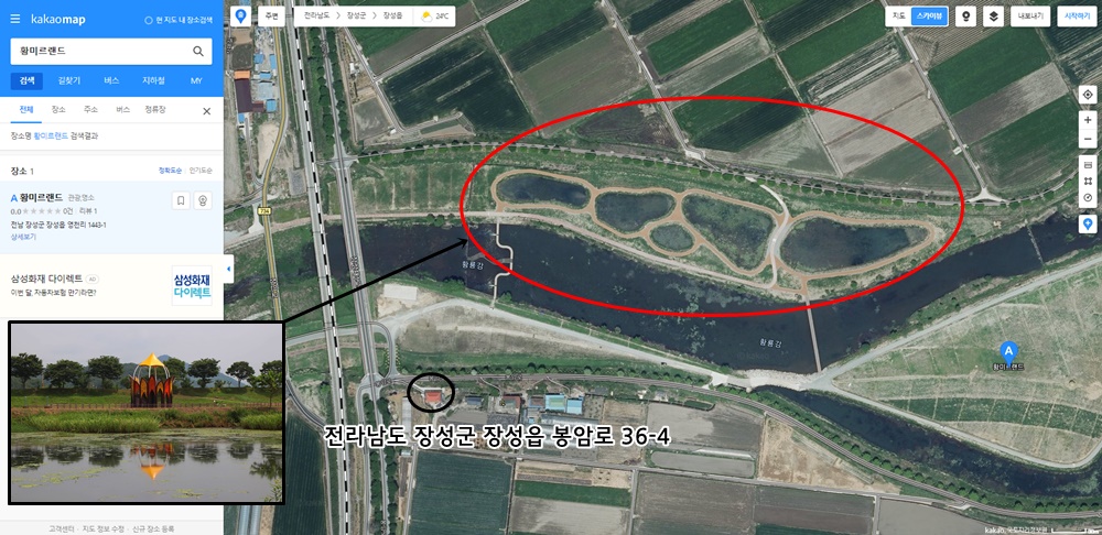 황미르랜드를 찾아가는 길은 전라남도 장성군 장성읍 봉암로 36-4 (전남 장성군 장성읍 영천리 1443-1)에 있는 농가를 기준으로 삼으시면 편리합니다.