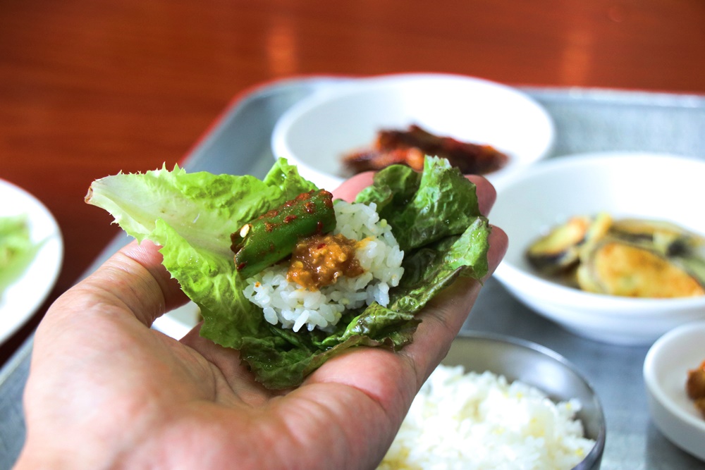 먼저 상추쌈에 밥을 한 숟가락 얹고 아삭한 고추와 된장을 올려 한입에 먹습니다.
