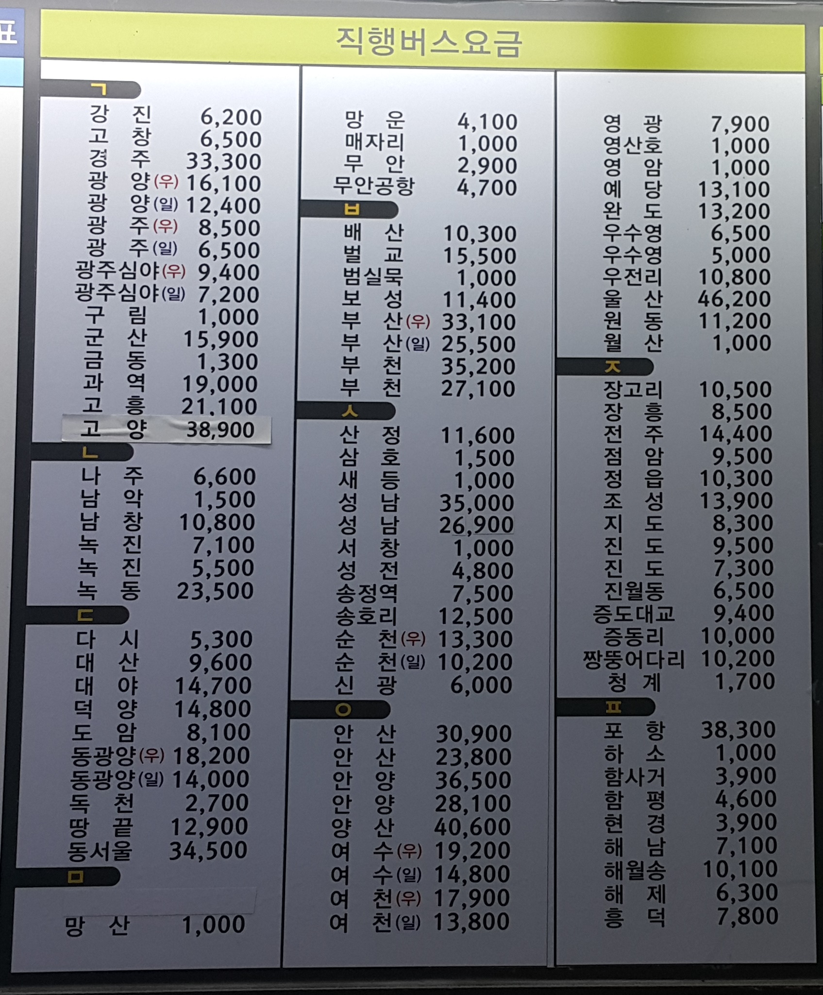 목포 출발 동서울, 성남, 안산, 부천, 고양, 안양 방면.
