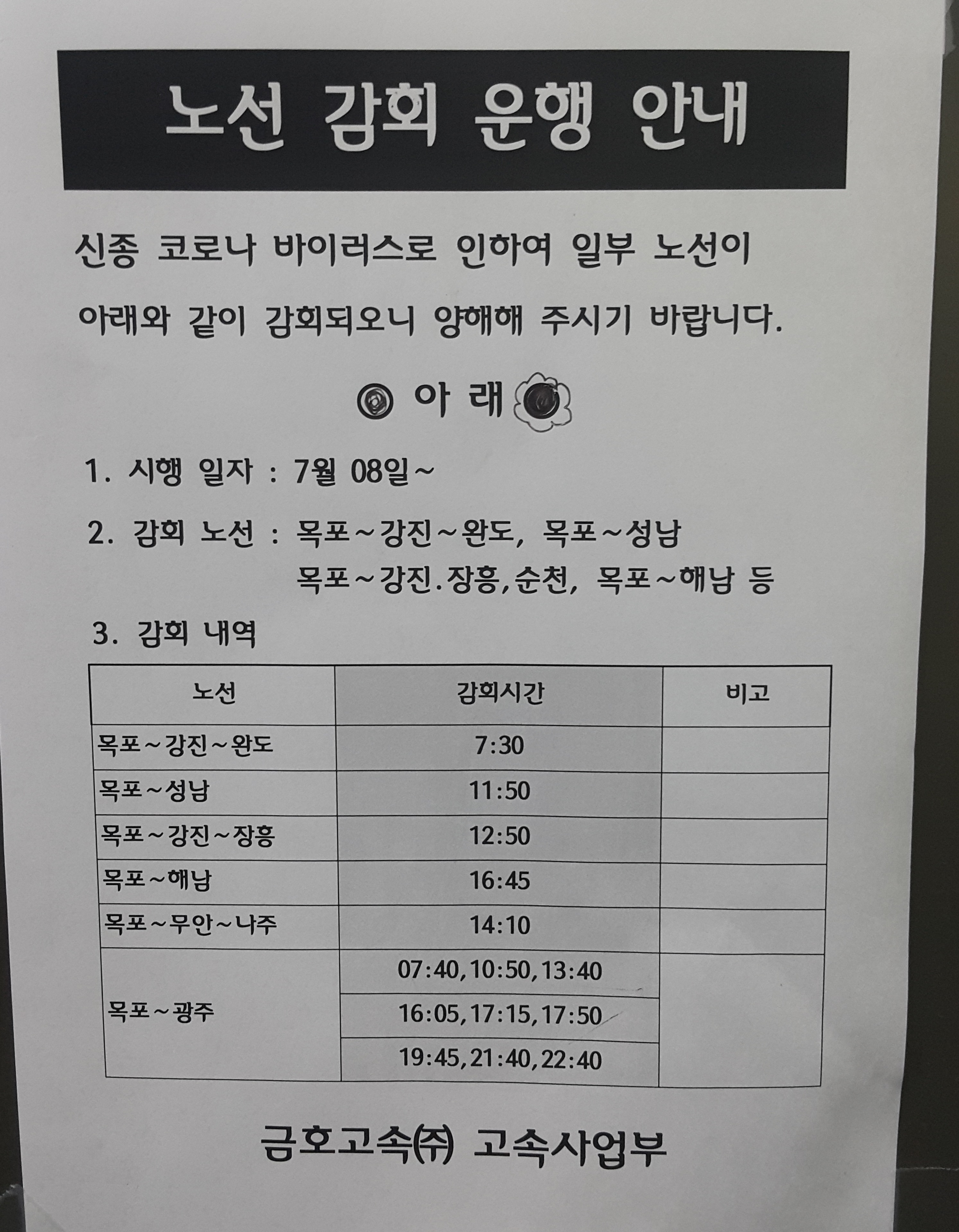 목포~화원~해남 시간 변경