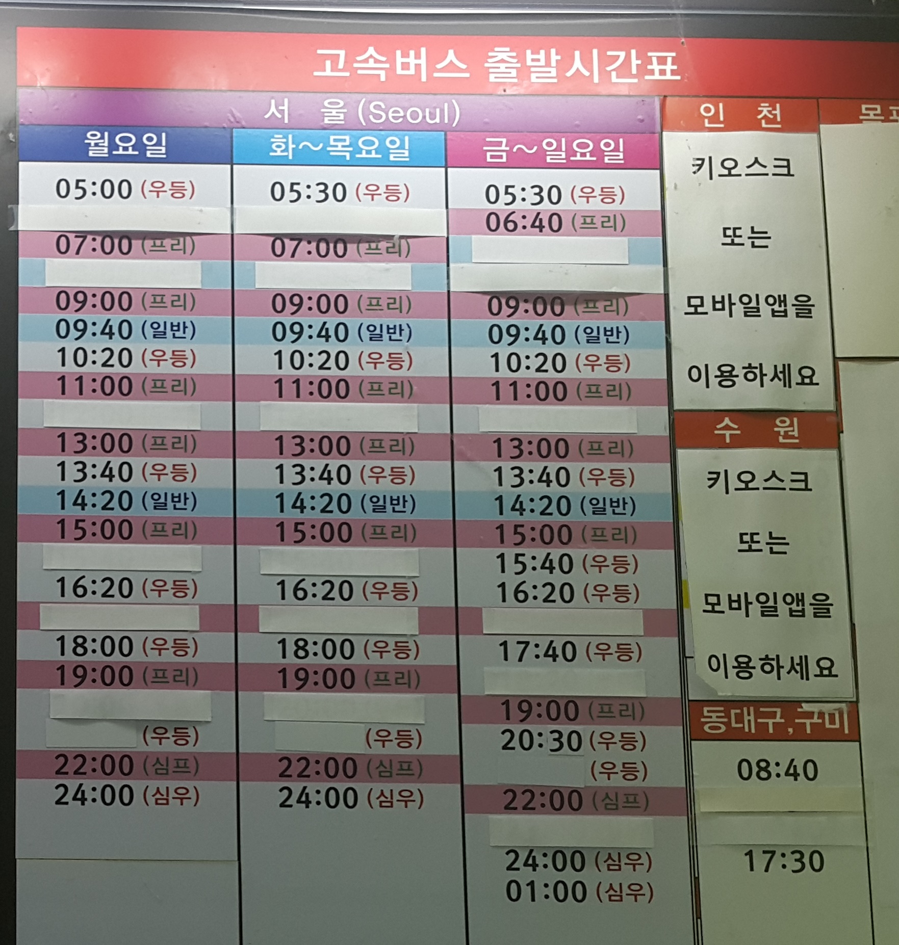 목포 출발 서울, 동대구, 구미 방면
