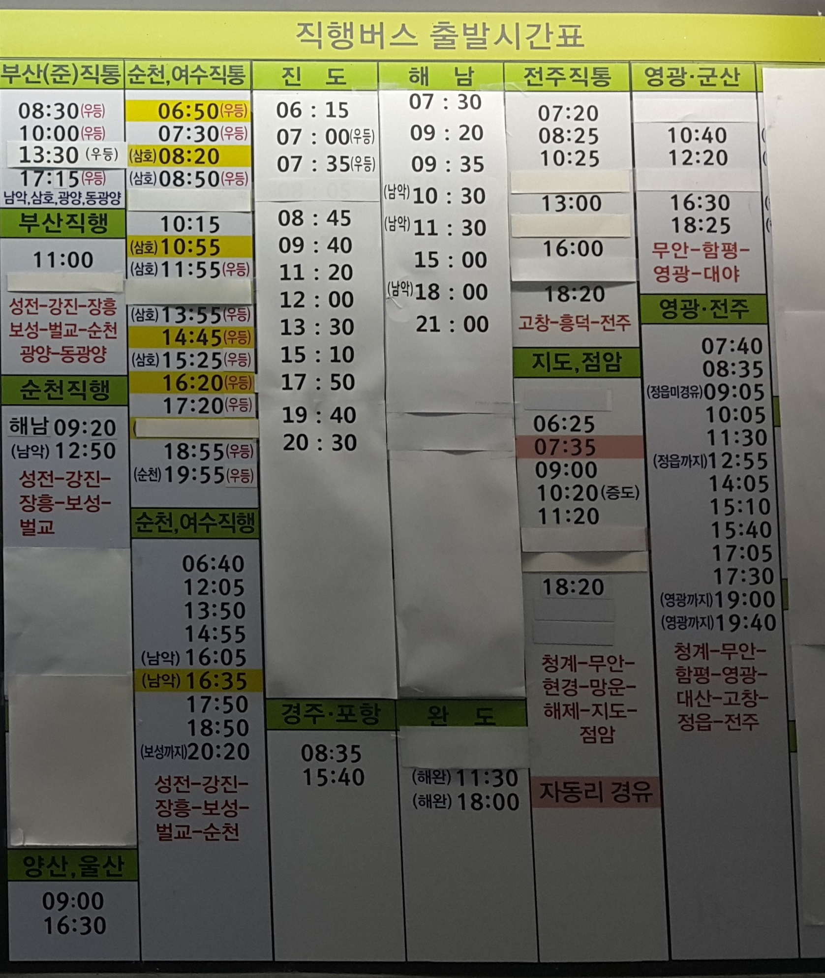 목포 출발 부산, 순천, 여수, 양산, 울산, 진도, 해남, 전주, 지도, 점암, 경주, 포항, 완도, 영광, 군산, 전주,