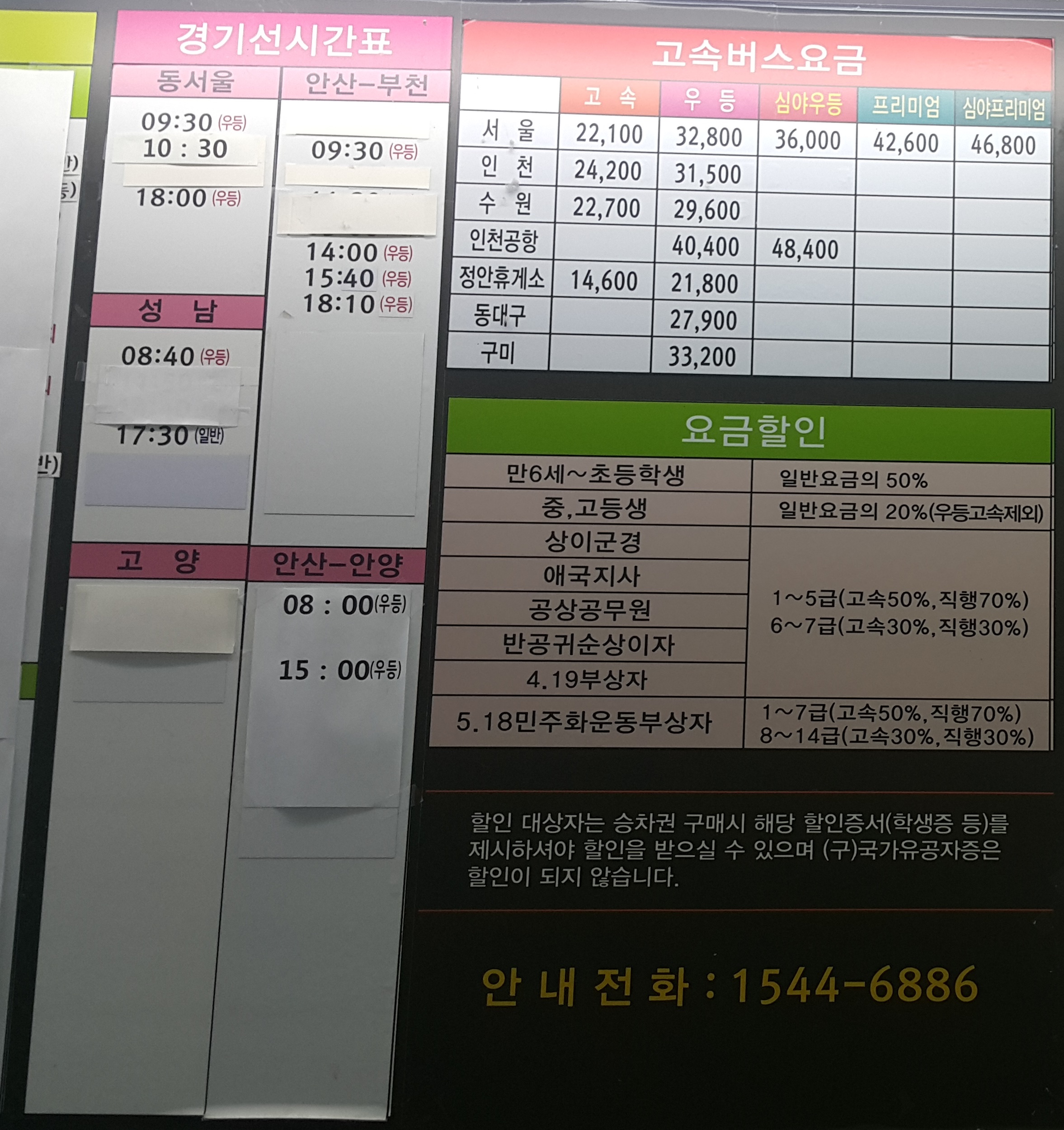 목포 출발 동서울, 성남, 안산, 부천, 고양, 안양 방면.
