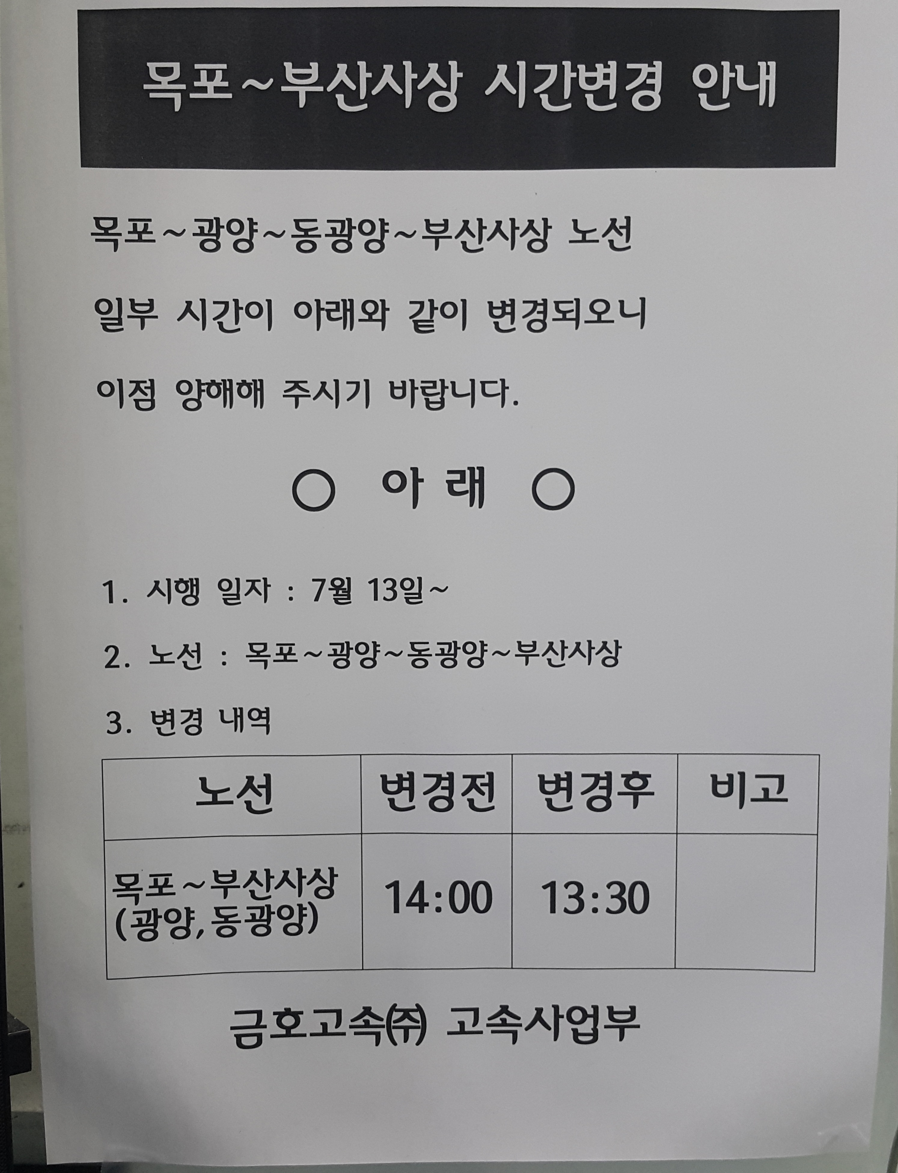 목포 출발 부산 사상 시간 변경