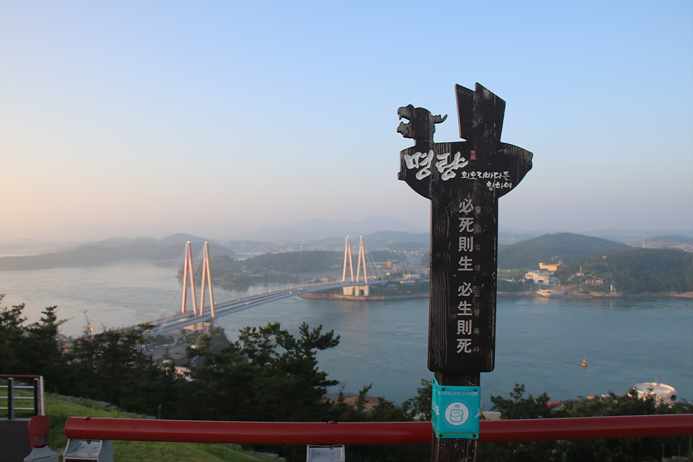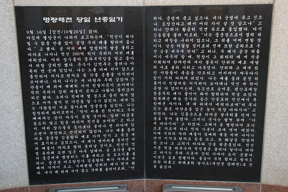 명랑해전 당일 난중일기가 각석되어 있어 이곳에서일어났었던 당시의 상황을 알수 있습니다.