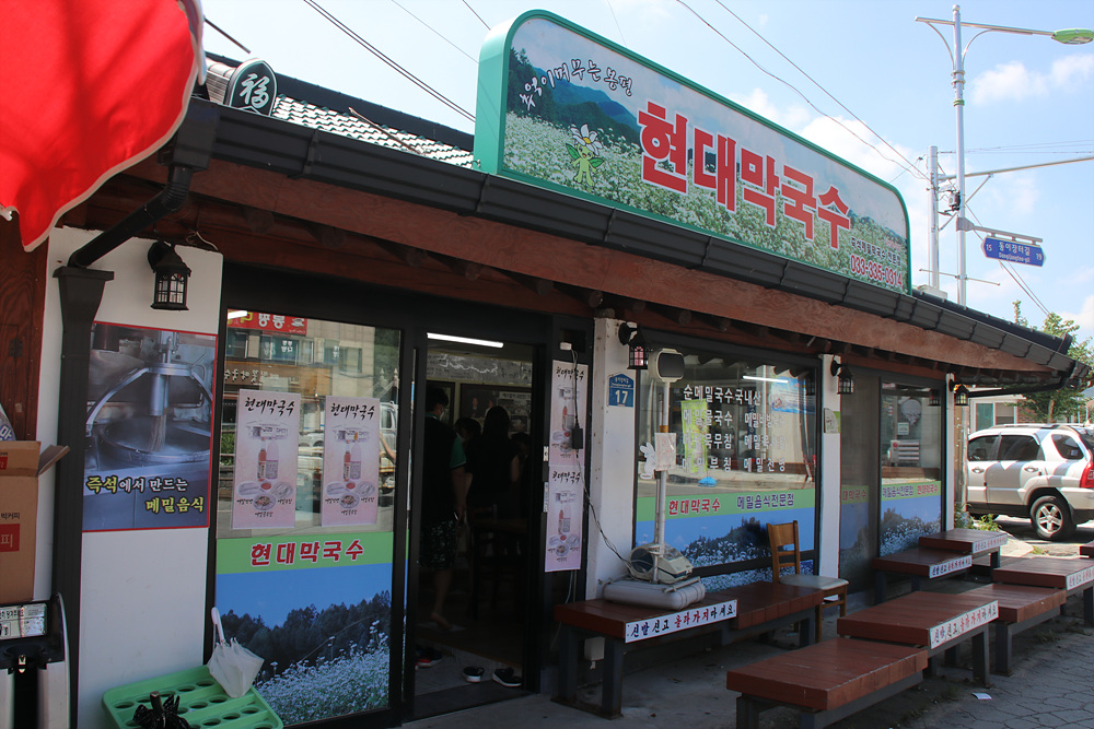 점심시간이 되어 봉평의 유명한 현대막국수를 찾아 메밀막국수를 주문하여 먹었습니다.