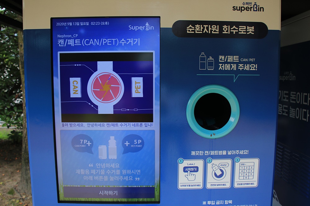 이제 김해산책 후에는 빈 병과 페트병은 AI 재활용품 회수 로봇 스마트쉼터 쉬고 가야에서 현금 포인트로