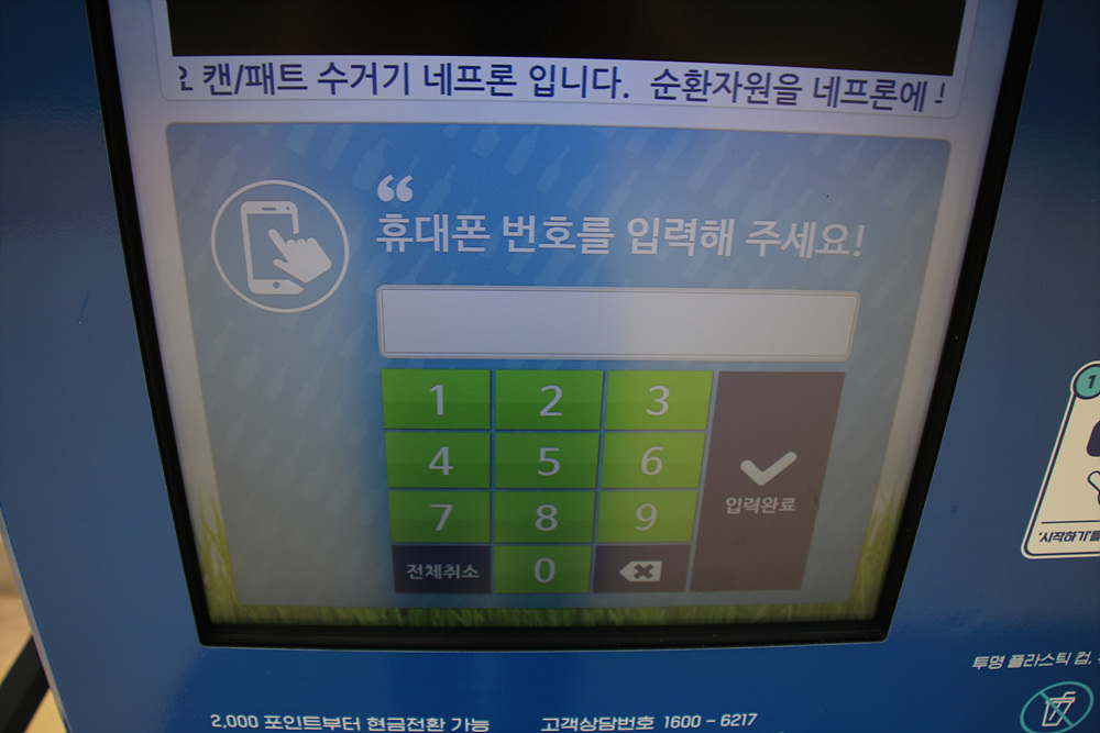 이후, 휴대폰 번호를 입력하면 캔은 7포인트, 페트병은 5포인트가 적립되며,
