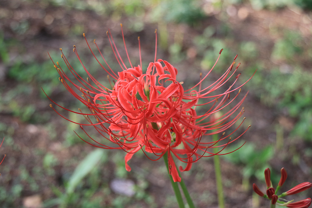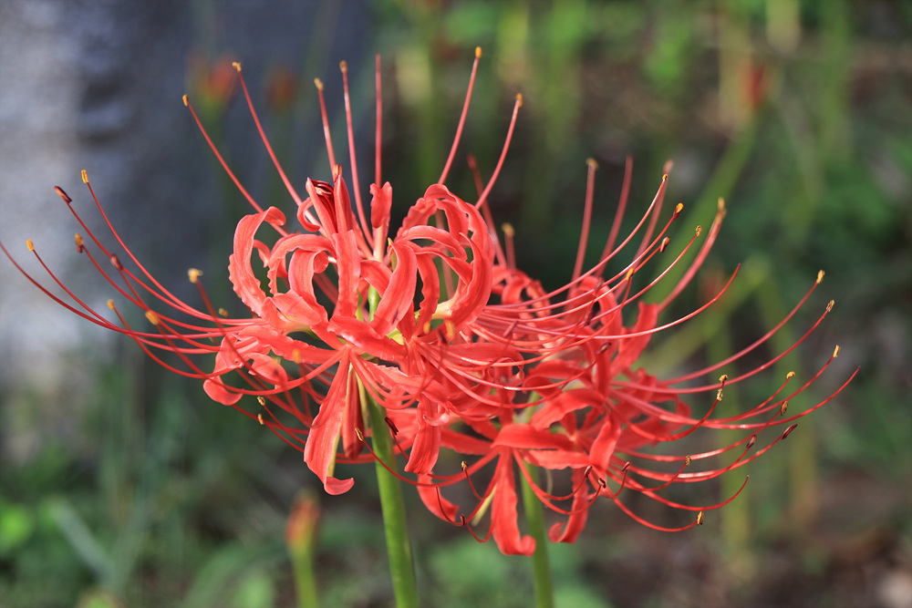 꽃무릇은 녹색 줄기가 길게 서 있으며 그 위에 꽃이 달려 있는데요,