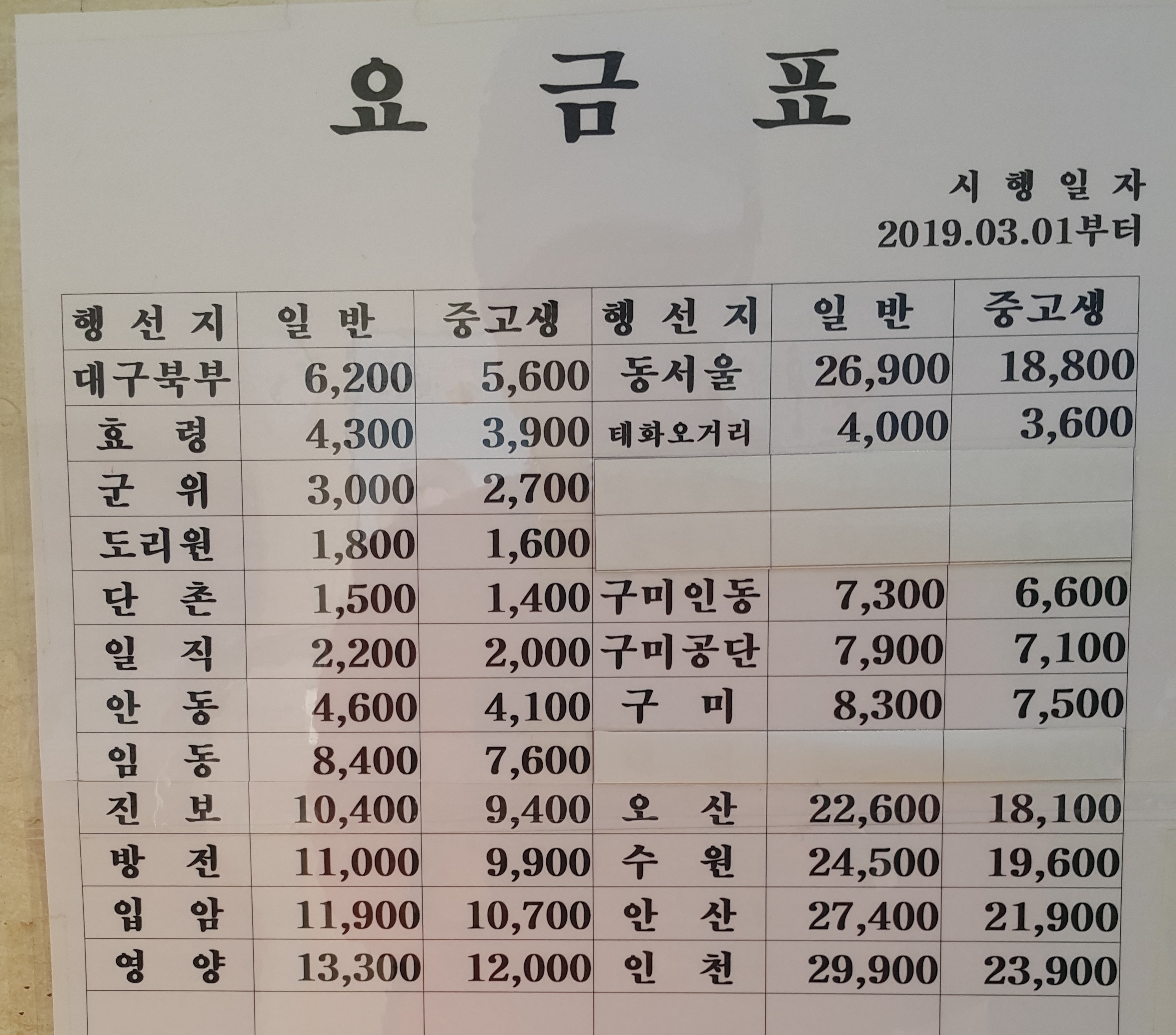 대구북부, 효령, 군위, 도리원, 단촌, 일직, 안동, 임동, 진보, 방전, 입암, 영양, 동서울, 태화오거리, 구미인동, 구미공단, 구미, 오산, 수원, 안산, 인천 요금표.