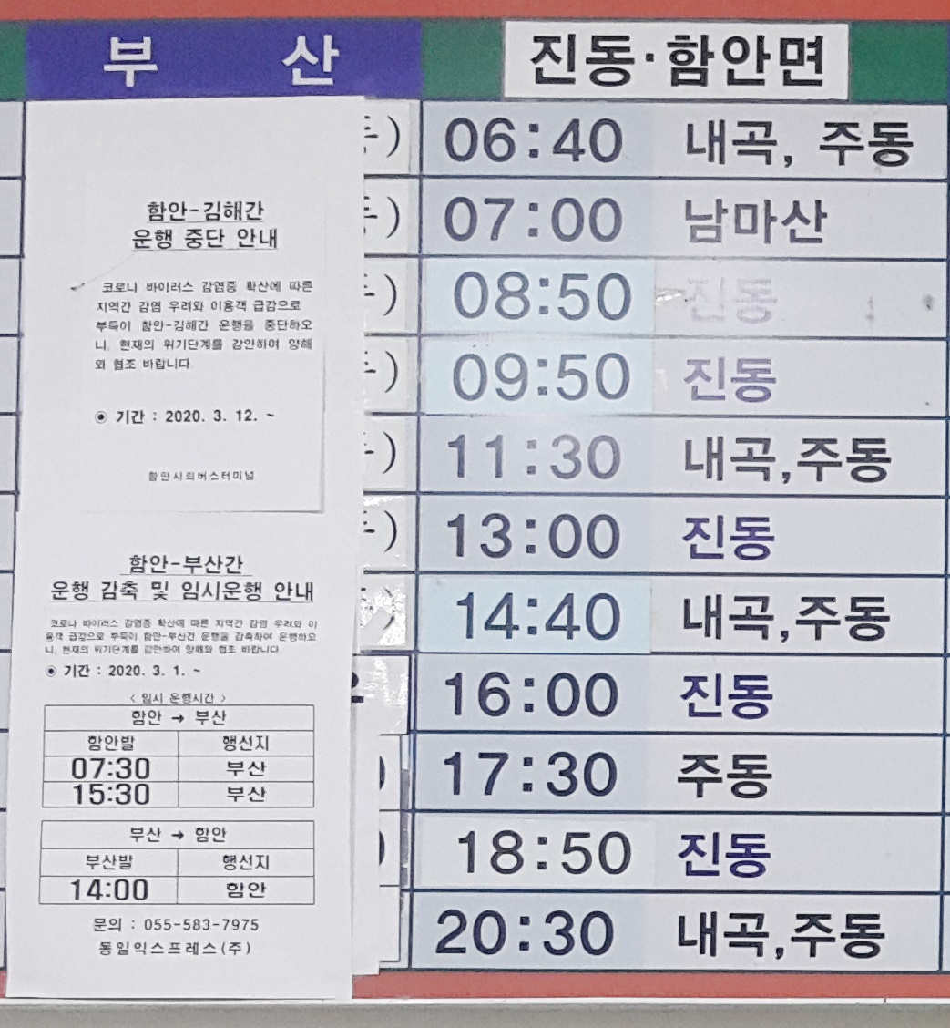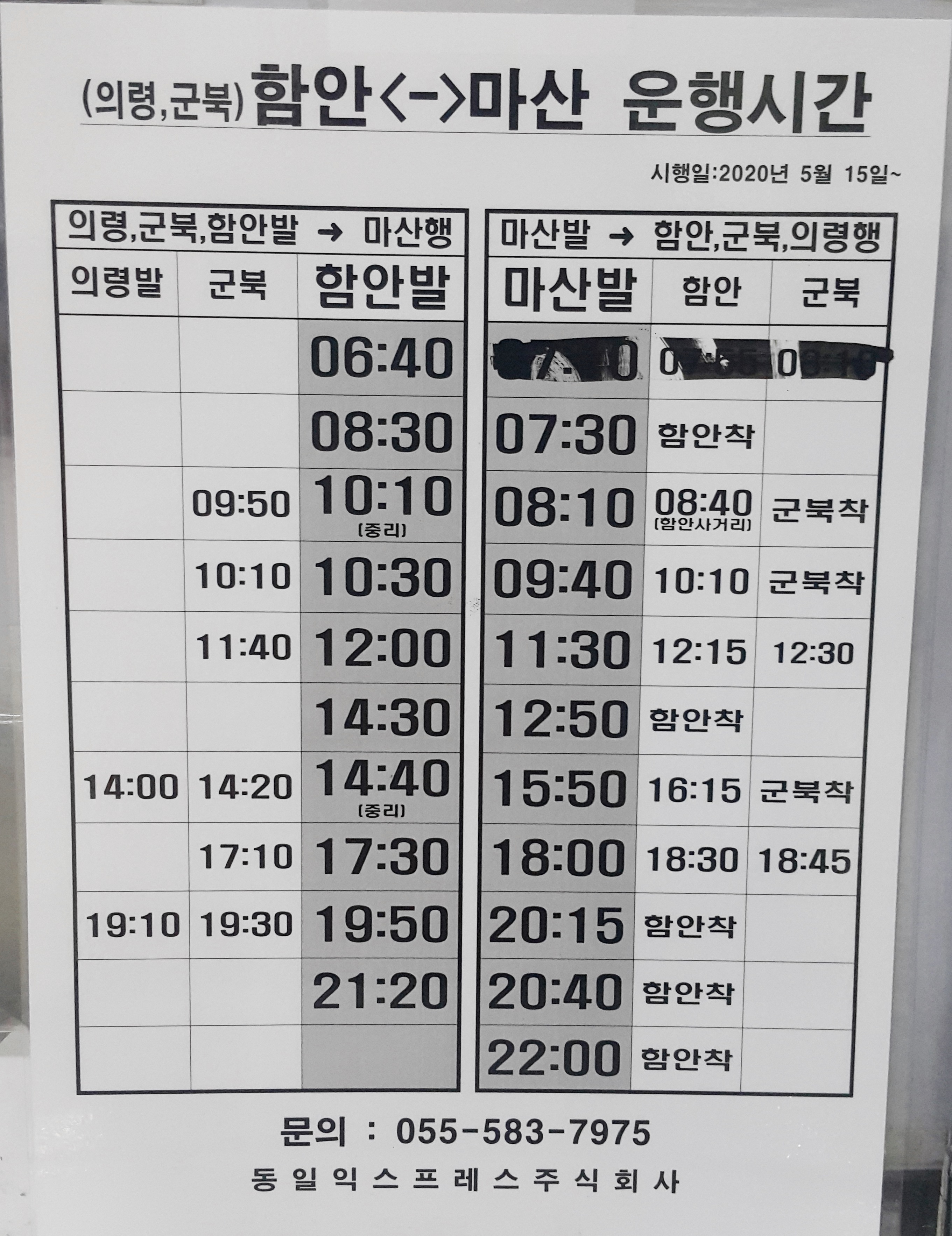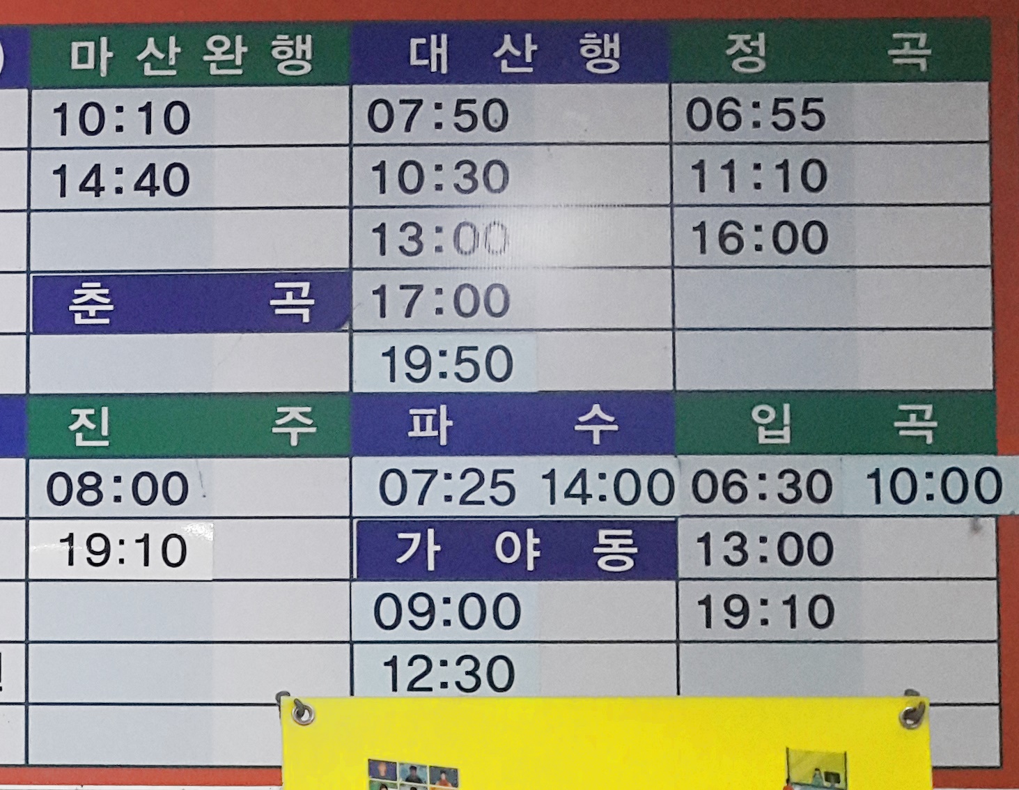 함안 출발 마산, 대산, 정곡, 춘곡, 진주, 파수, 입곡, 가야동 방면.