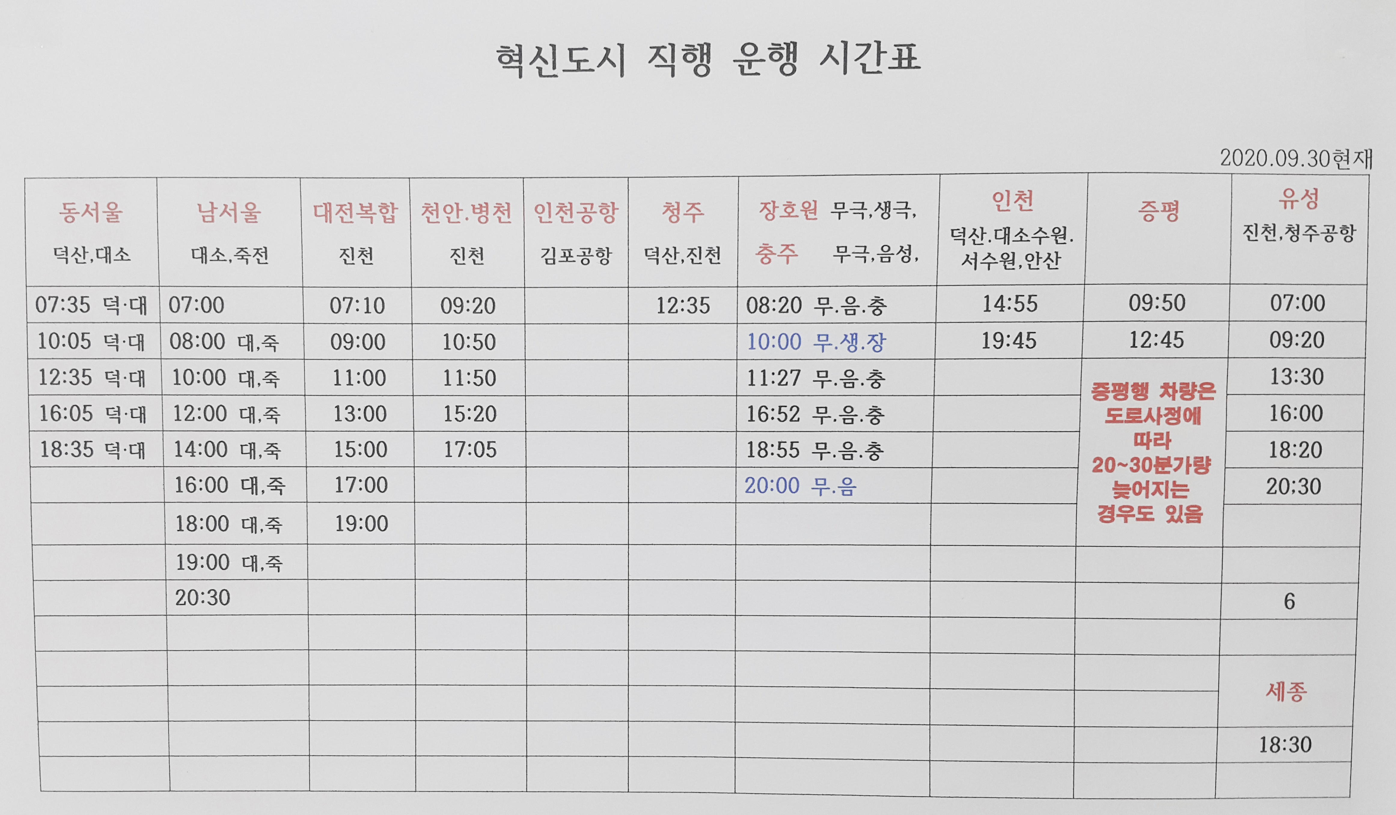 헉신도시 직행 운행시간표