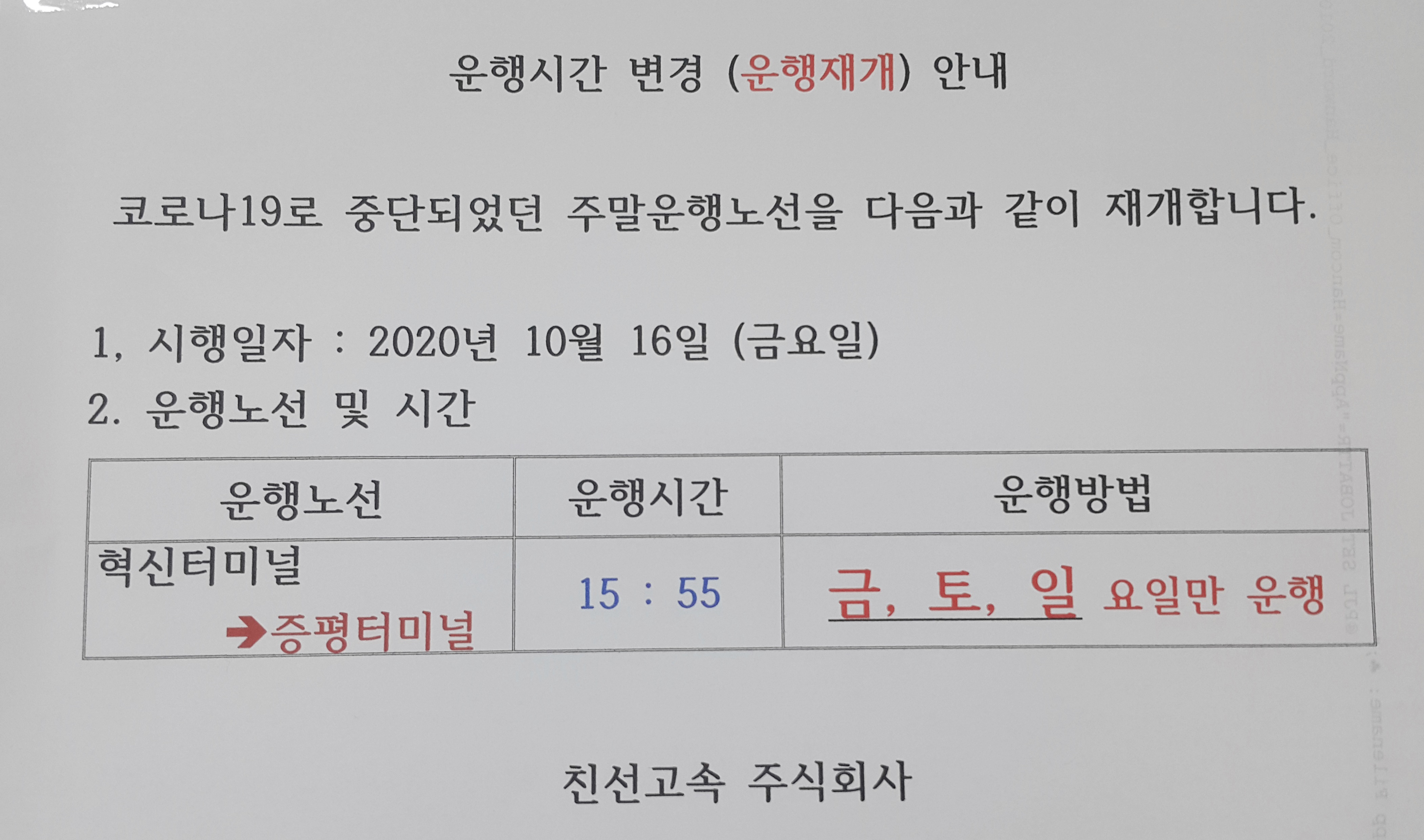 혁신터미널~증평터미널 운행재개