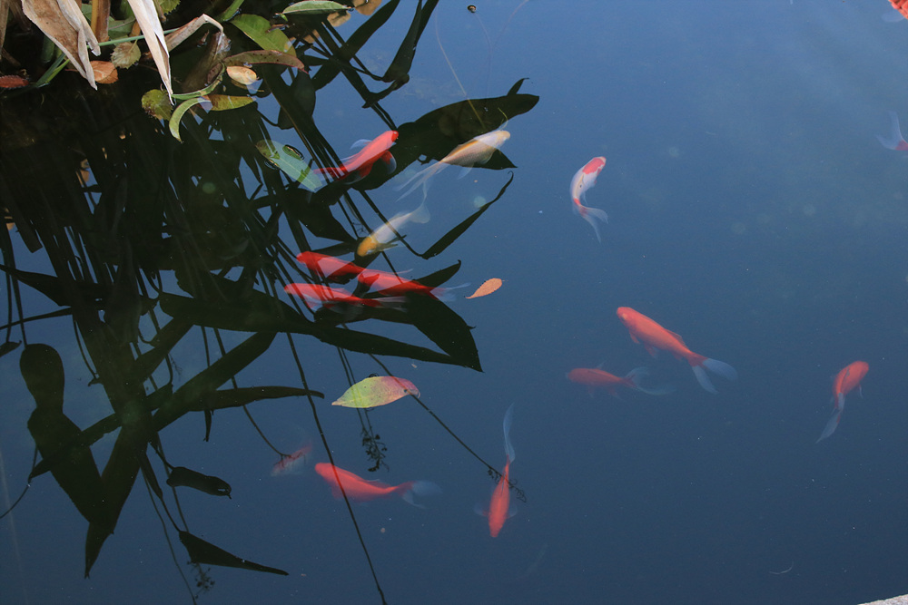 연못에 있는 물고기와 떨어진 낙엽의 색상이 비슷한 것 같아