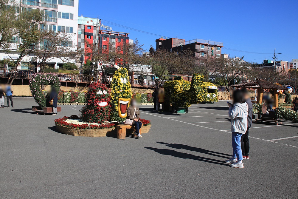 아이들의 인기 캐릭터 라바와 타요 등등 국화조형물이 있어서 아이들이