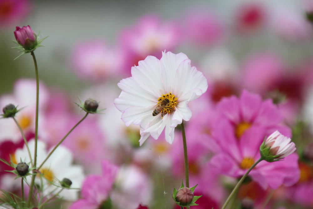 이 꿀벌이 많은 활동을 하여 코스모스도 더욱 많이 자라고